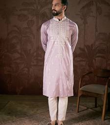 Men lavender silk blend solid embroidered straight kurta