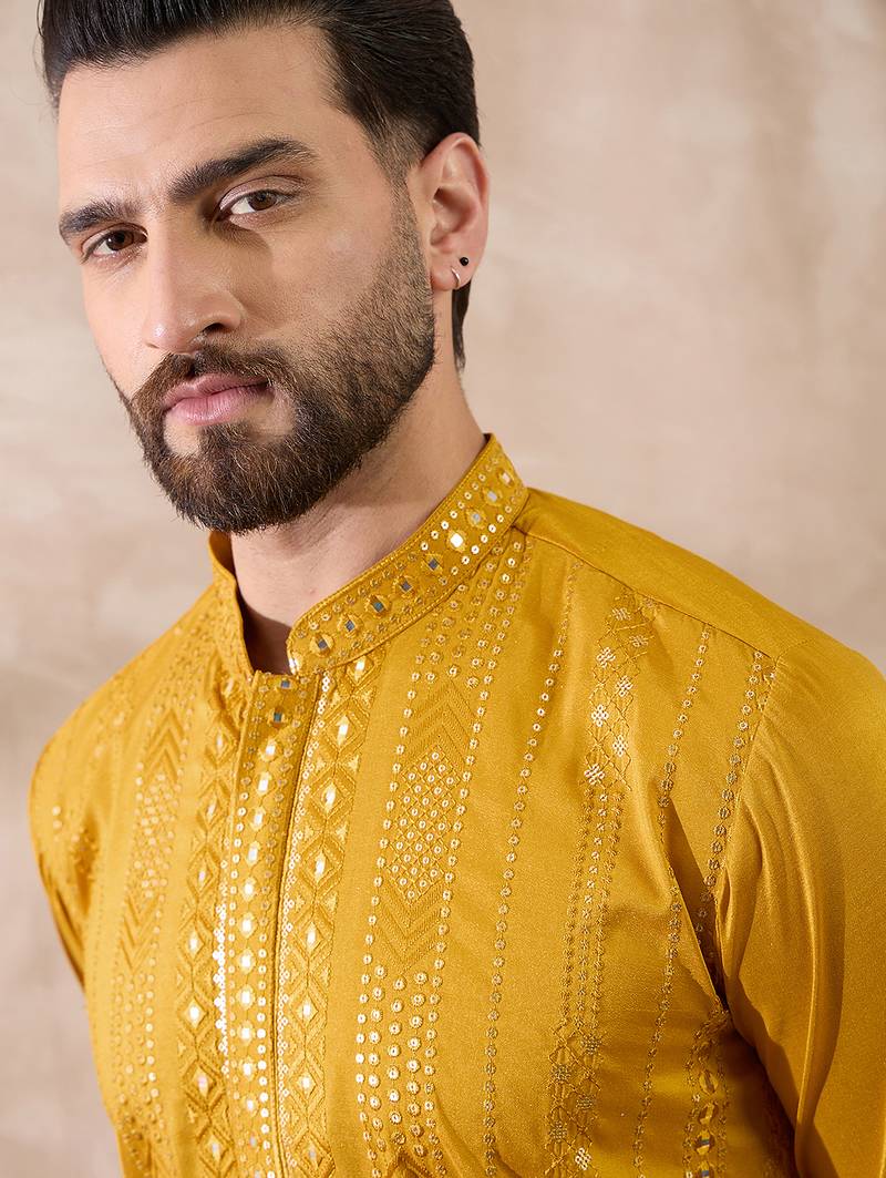| Product Name | Men Mustard Silk Blend Embroidered Mandarin Collar Straight Kurta | |