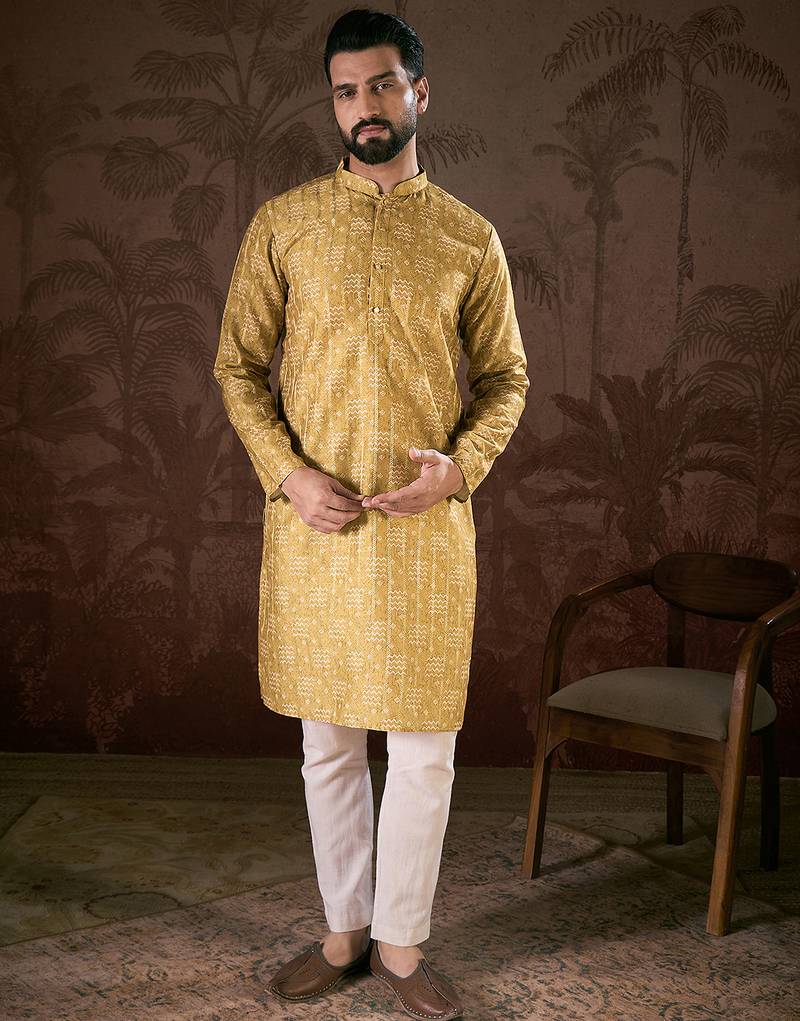 | Product Name | Men Mustard Silk Blend Ethnic Motifs Printed Straight Kurta With Trouser | |