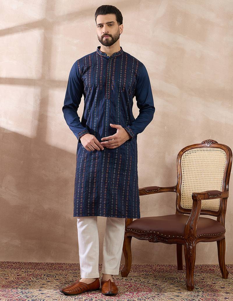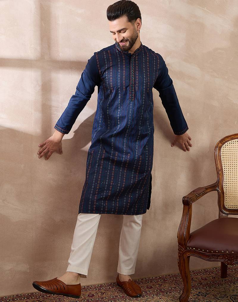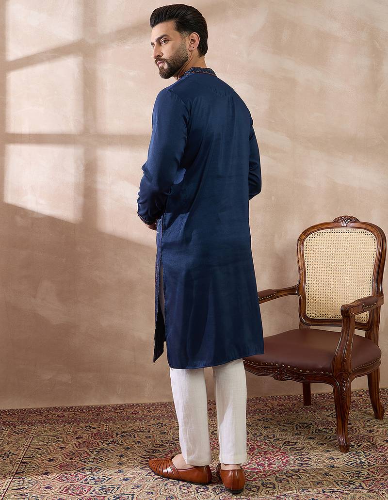 | Product Name | Men Navy Blue Silk Blend Embroidered Mandarin Collar Straight Kurta With Trouser | |