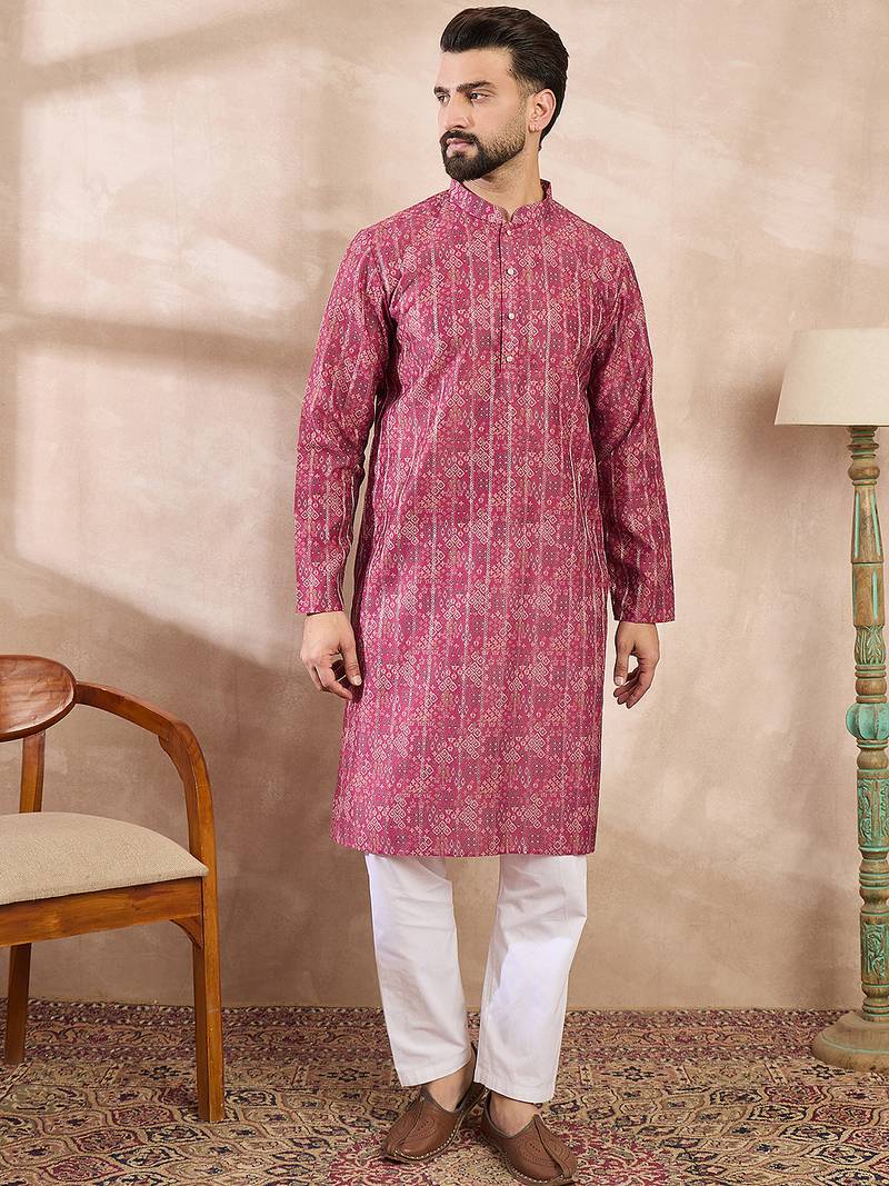 | Product Name | Men Pink Silk Blend Ethnic Motifs Printed Straight Kurta With Trouser | |