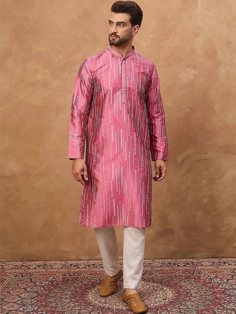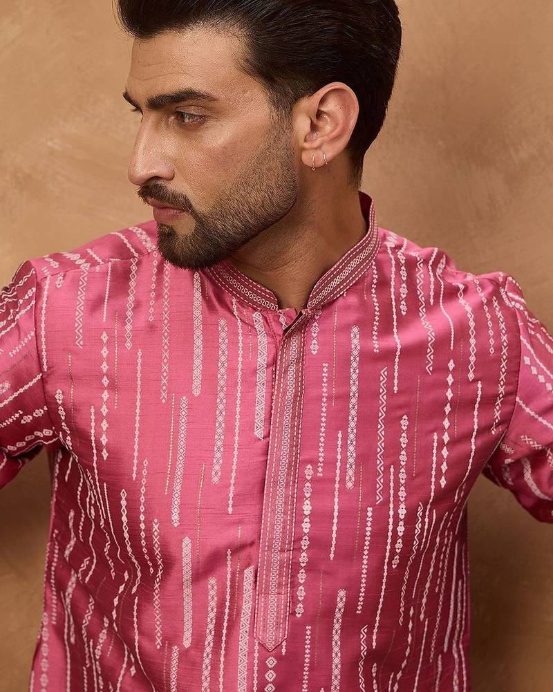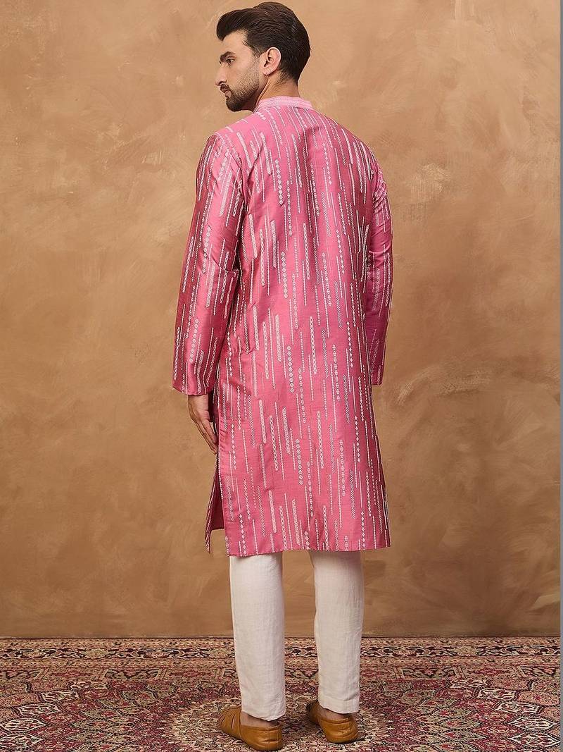 | Product Name | Men Pink Silk Blend Geometric Printed Straight Kurta With Pant Set | |