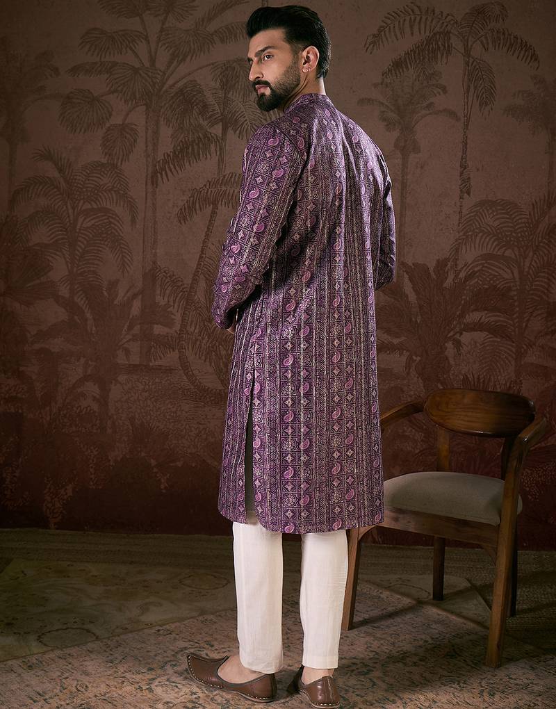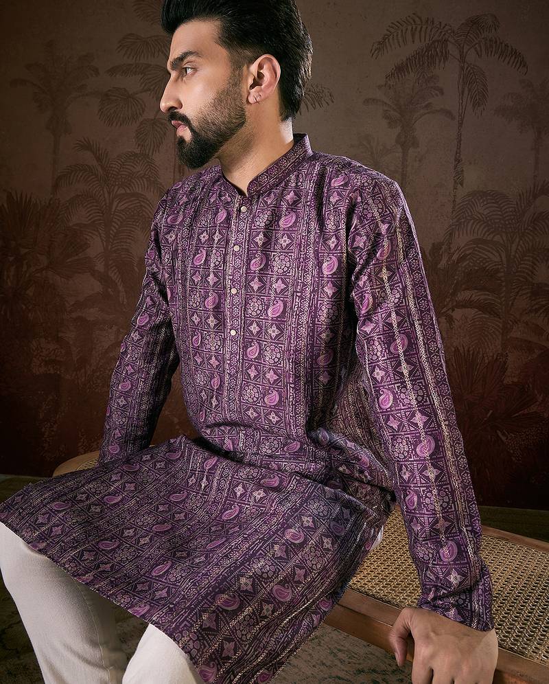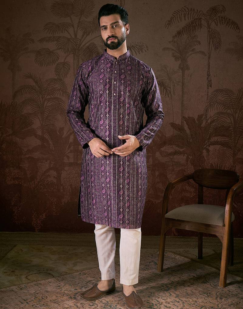 | Product Name | Men Purple Silk Blend Ethnic Motifs Printed Straight Kurta With Trouser | |