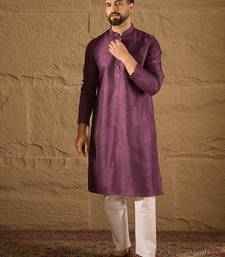 Men purple silk blend solid embroidered straight kurta