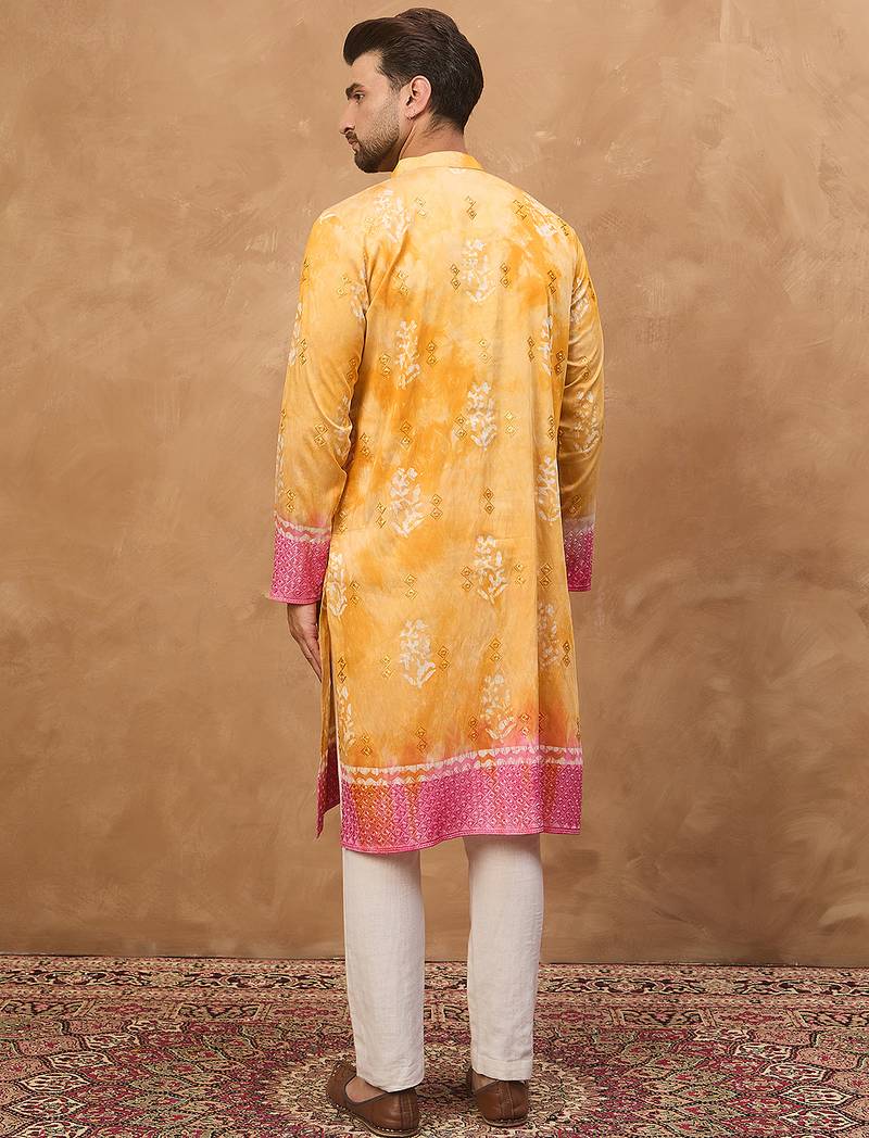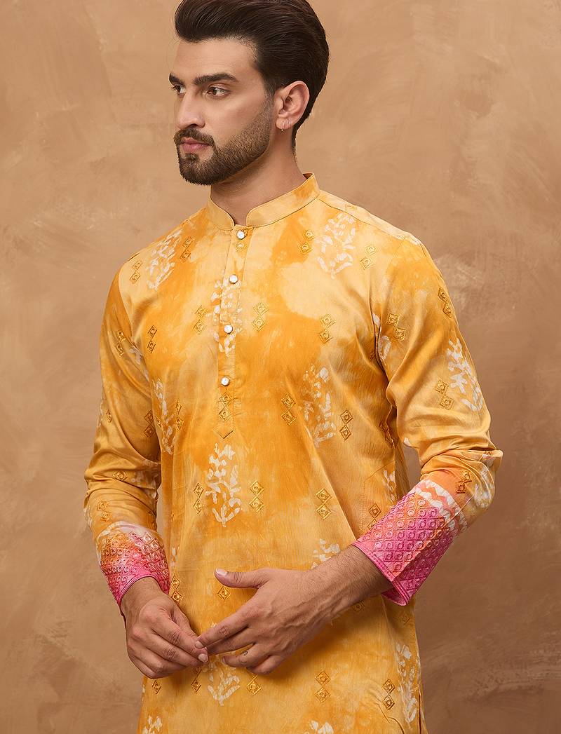| Product Name | Men Yellow Silk Blend Batik Embroidered Straight Kurta | |