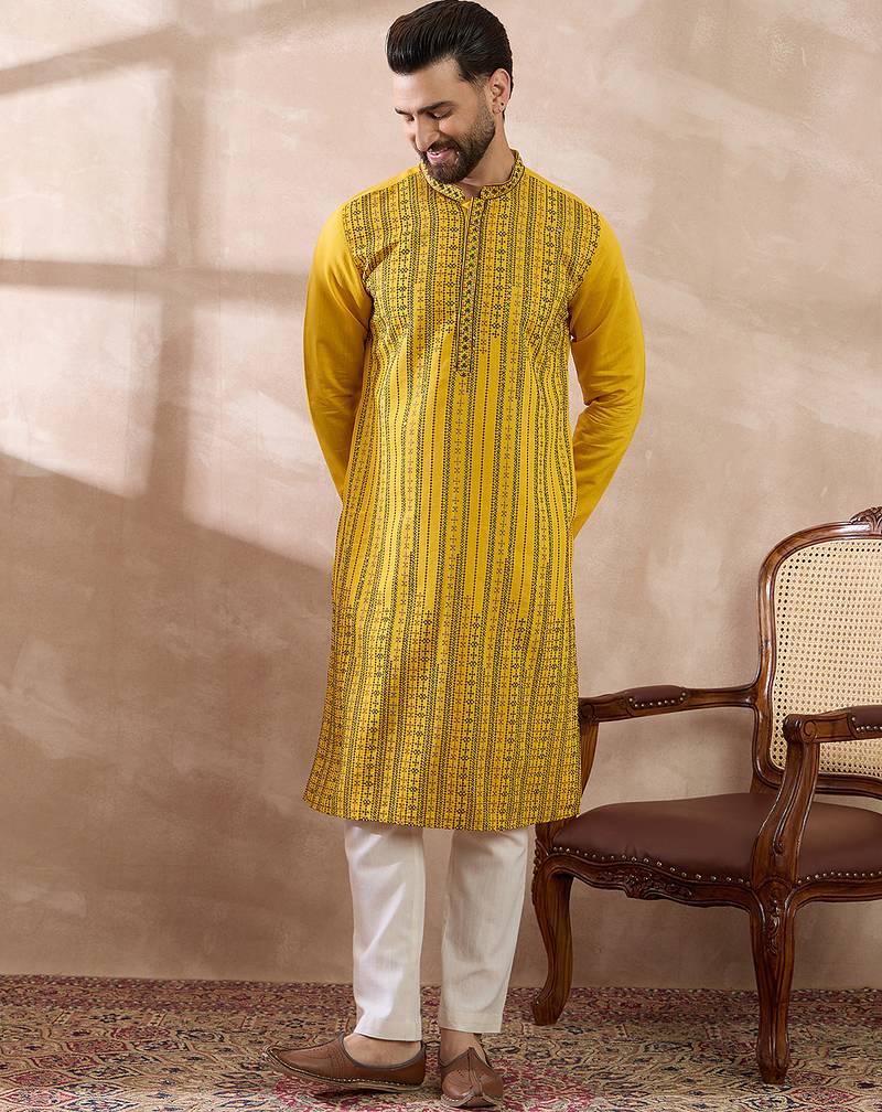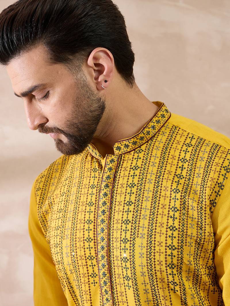| Product Name | Men Yellow Silk Blend Embroidered Mandarin Collar Straight Kurta With Trouser | |