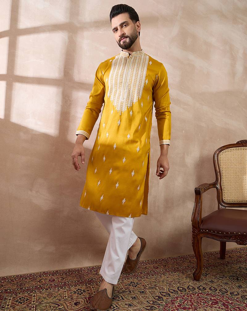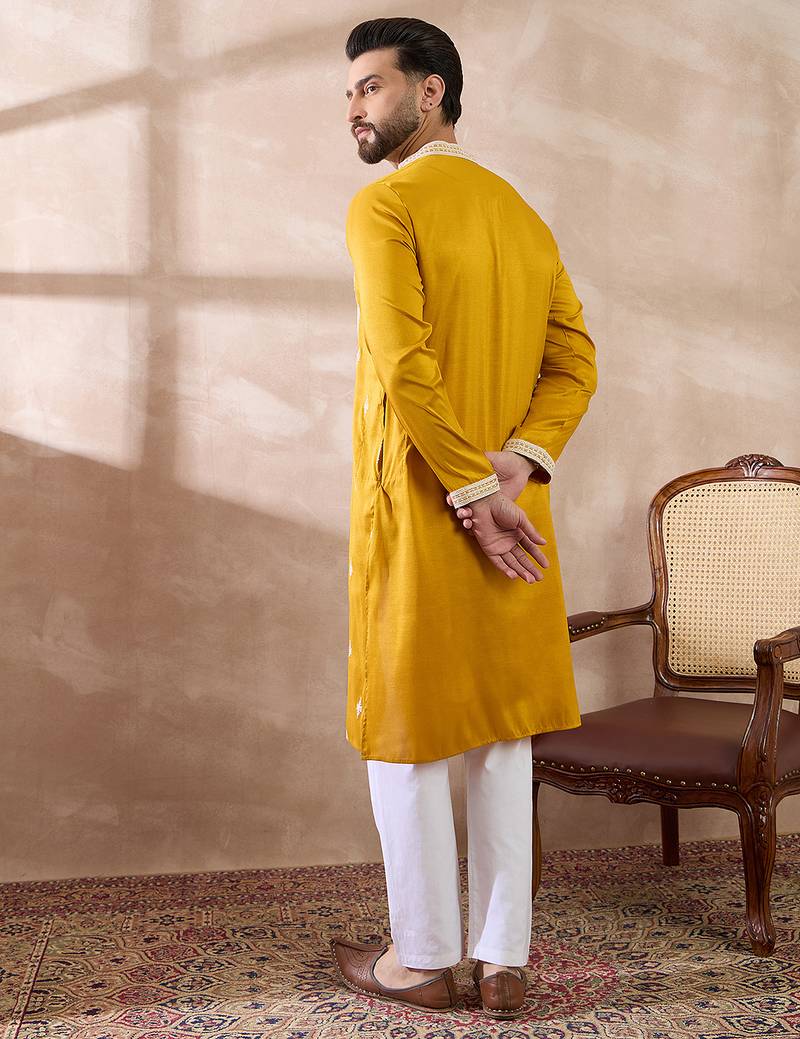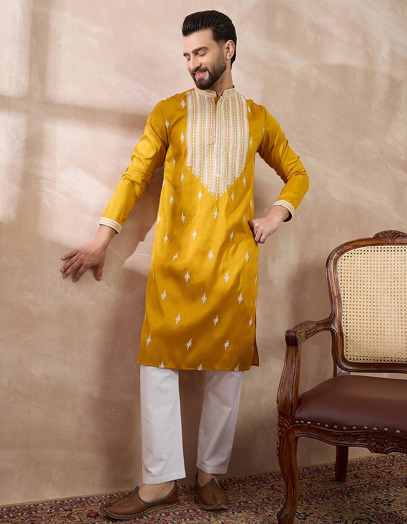 | Product Name | Men Yellow Silk Blend Embroidered Mandarin Collar Straight Kurta With Trouser | |