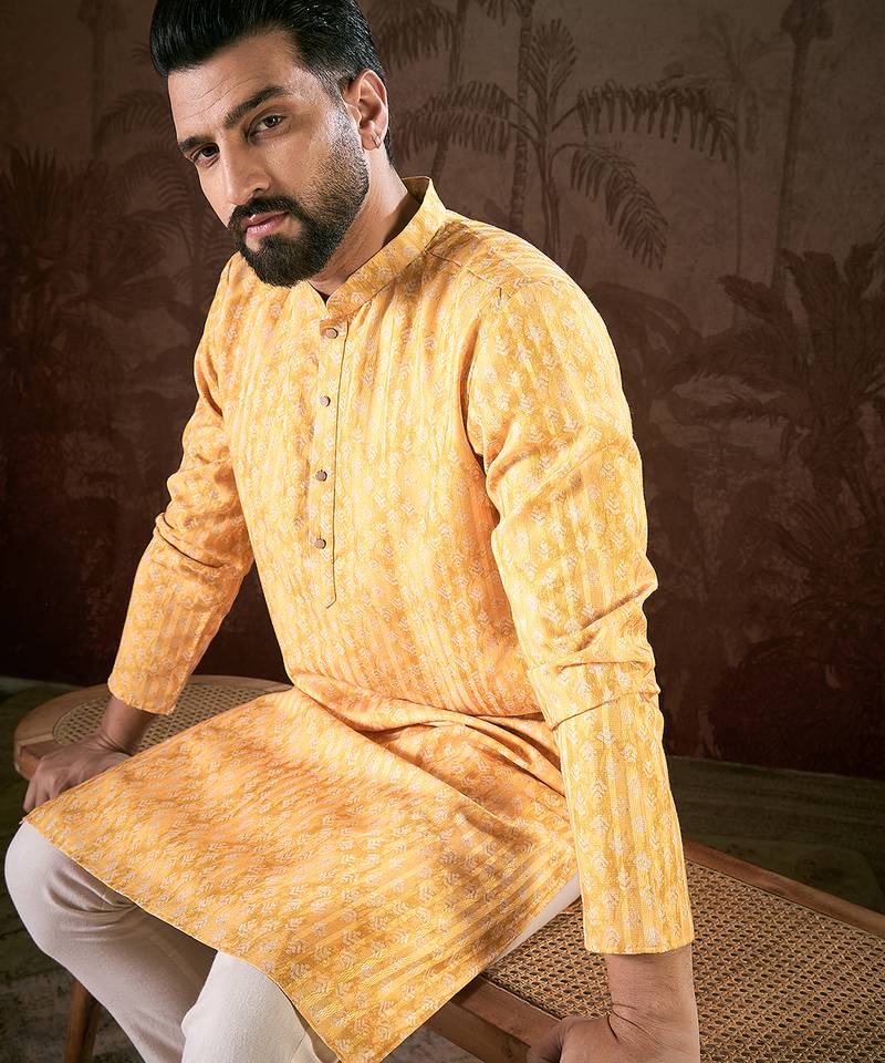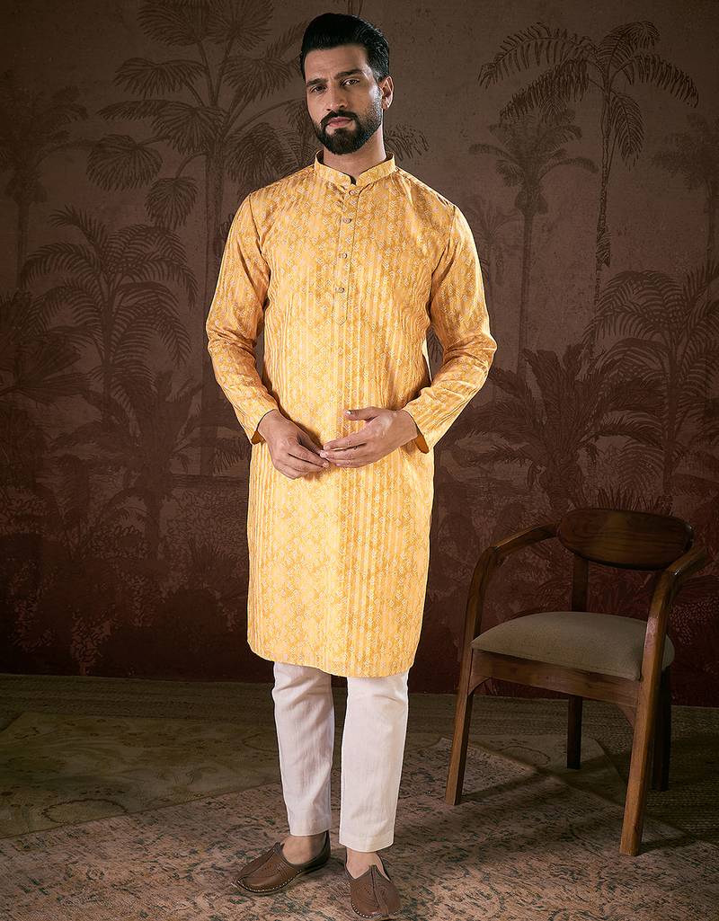 | Product Name | Men Yellow Silk Blend Ethnic Motifs Printed Straight Kurta With Trouser | |