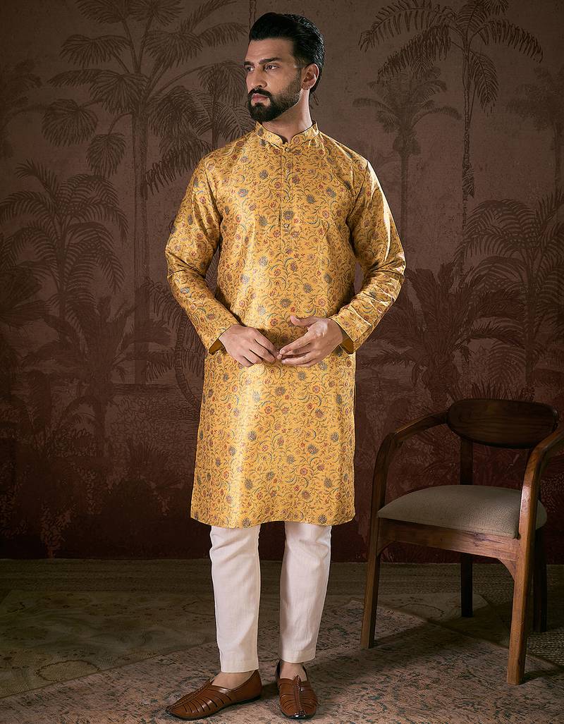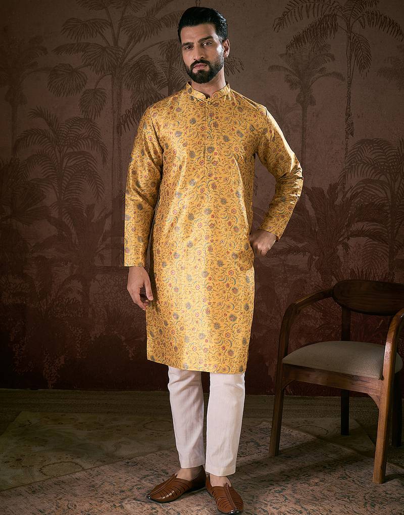 Men yellow silk blend floral printed straight kurta