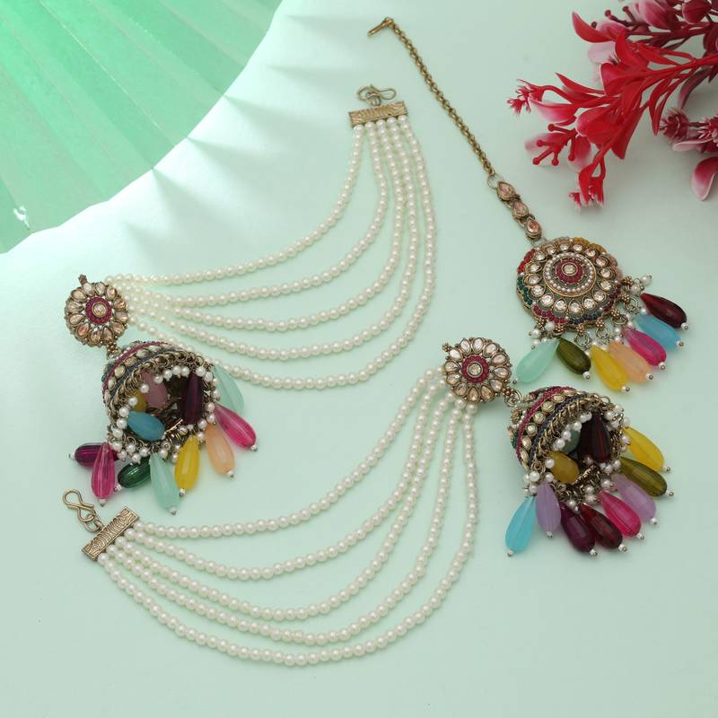 Multi color big jhumka kundan earrings tikka set bridal