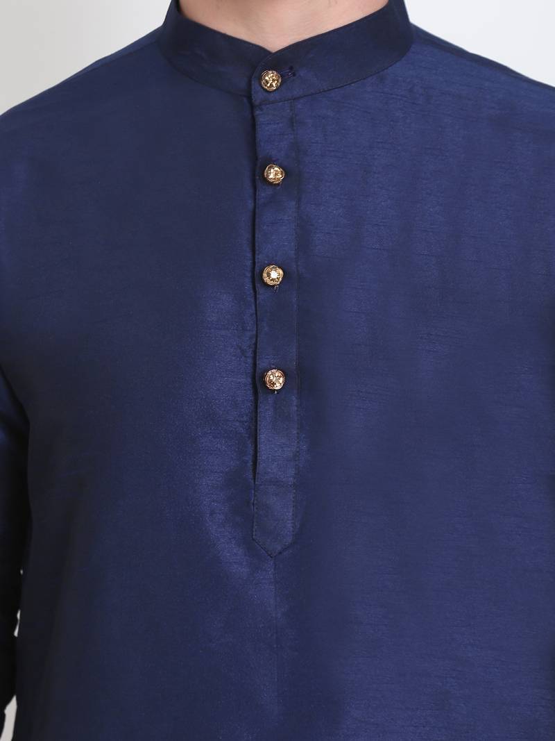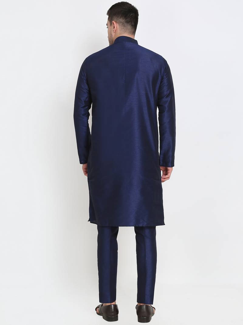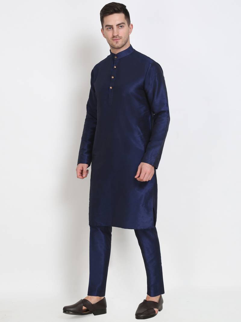 Elegant men's raw silk kurta with pants stitched dark blue color