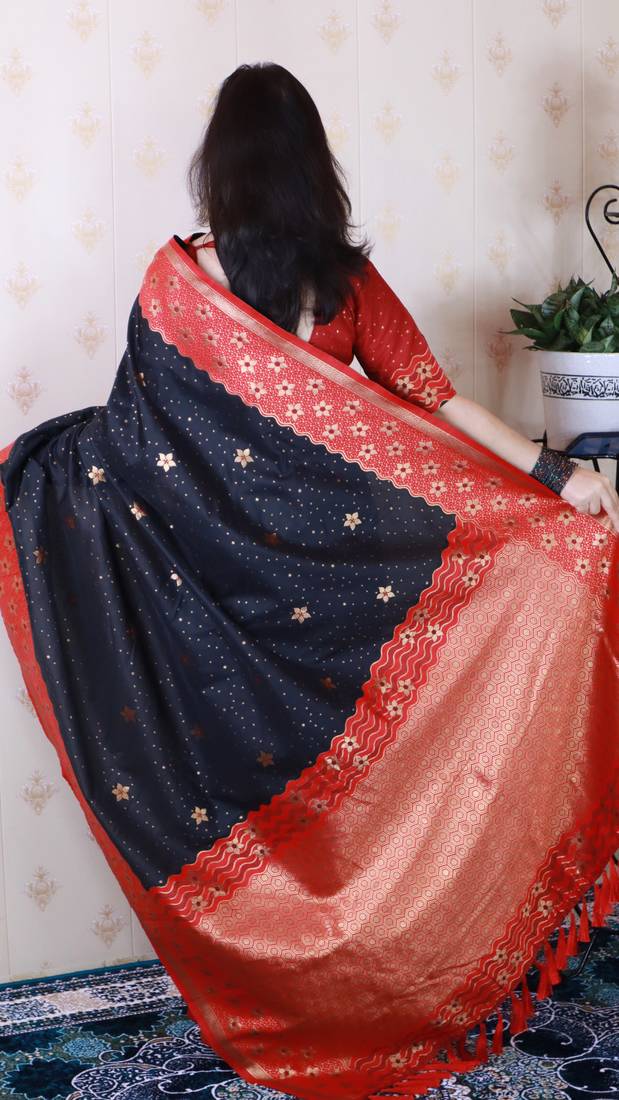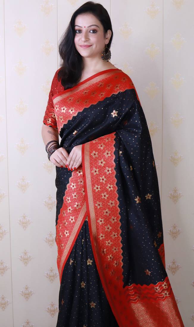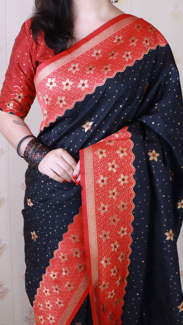 Black banarasi silk zari weaving saree with contrast blouse piece