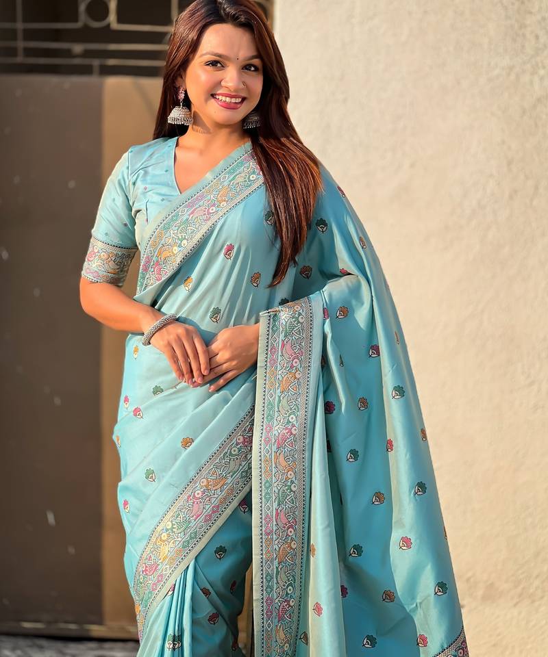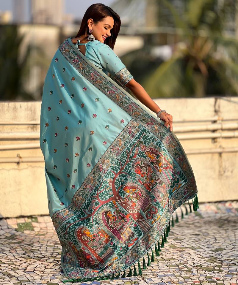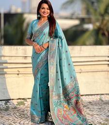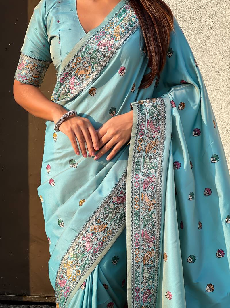 Blue soft silk baluchari zari meena weaving saree with matching blouse piece