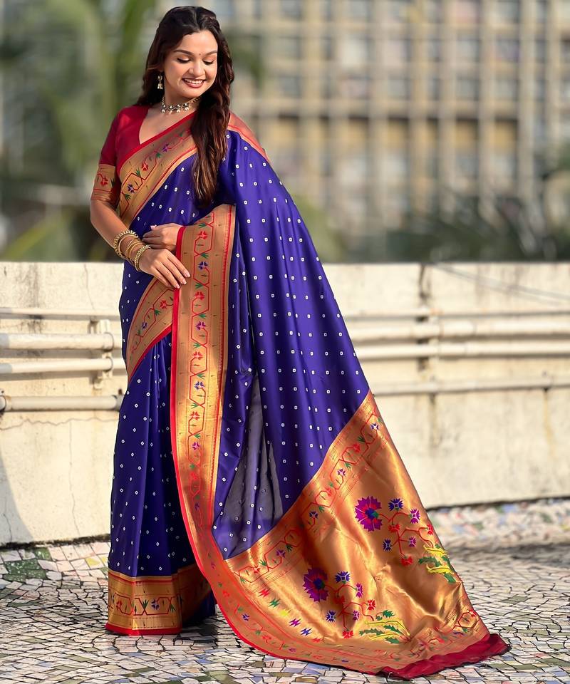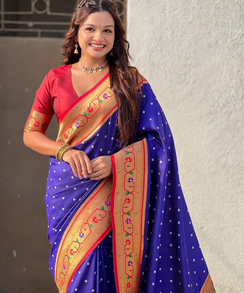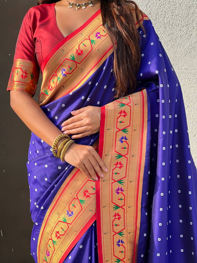 | Product Description | Soft Silk Sarees With Bandhani Zari Woven Motifs All Over The Body Having Rich Woven Paithani Meenakari Pallu And Paithani Simple Contrast Border Paired With Plain Contrast Blouse Same As |