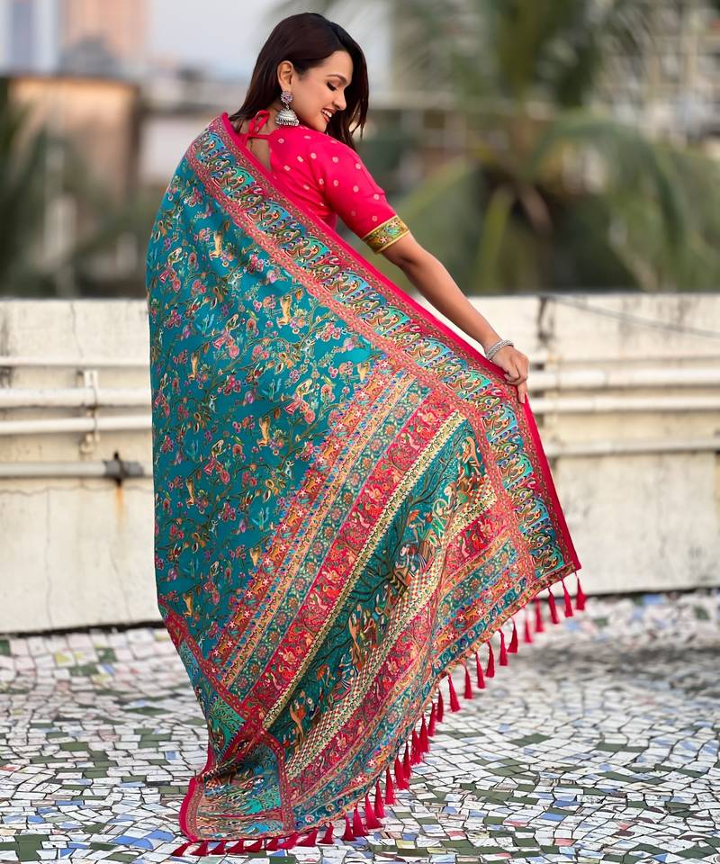 Blue viscose silk position print & zari weaving saree with contrast blouse piece