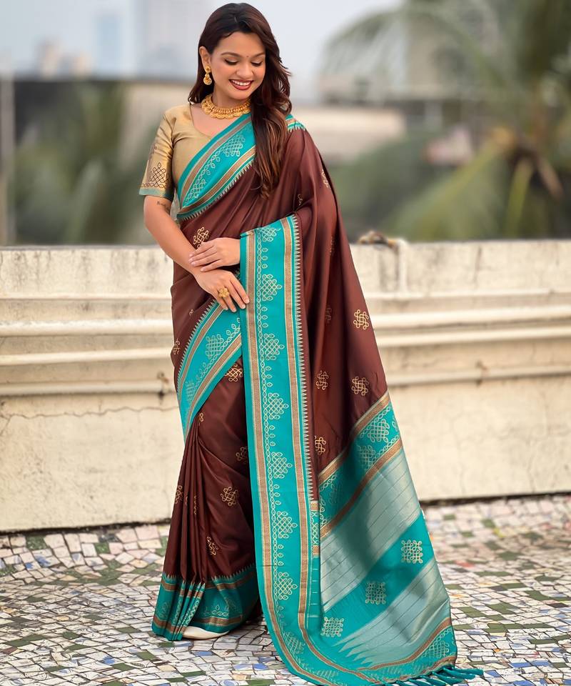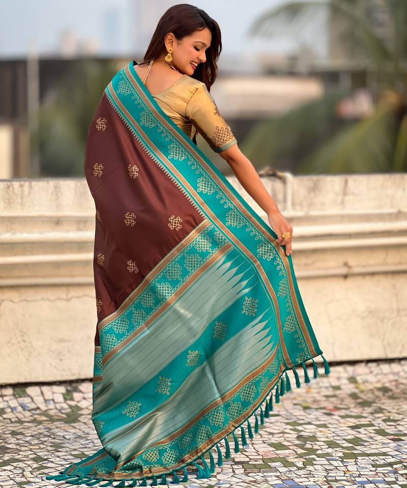 Brown soft silk rangoli art zari weaving saree with contrast blouse piece