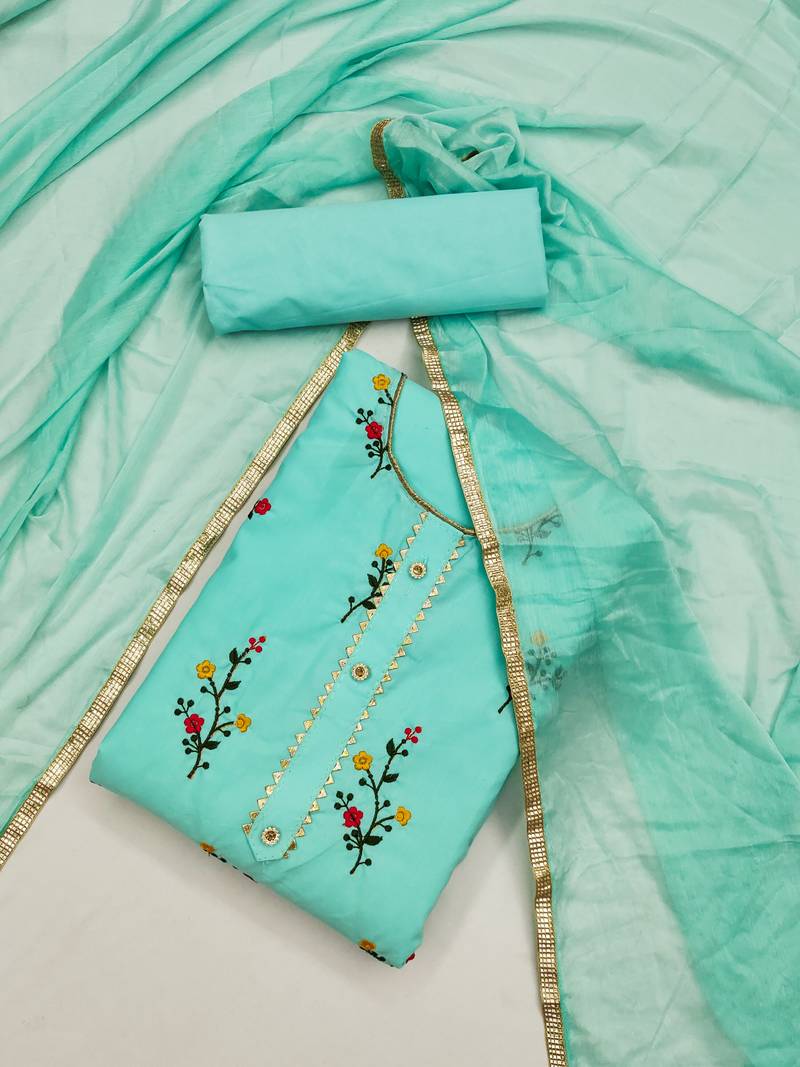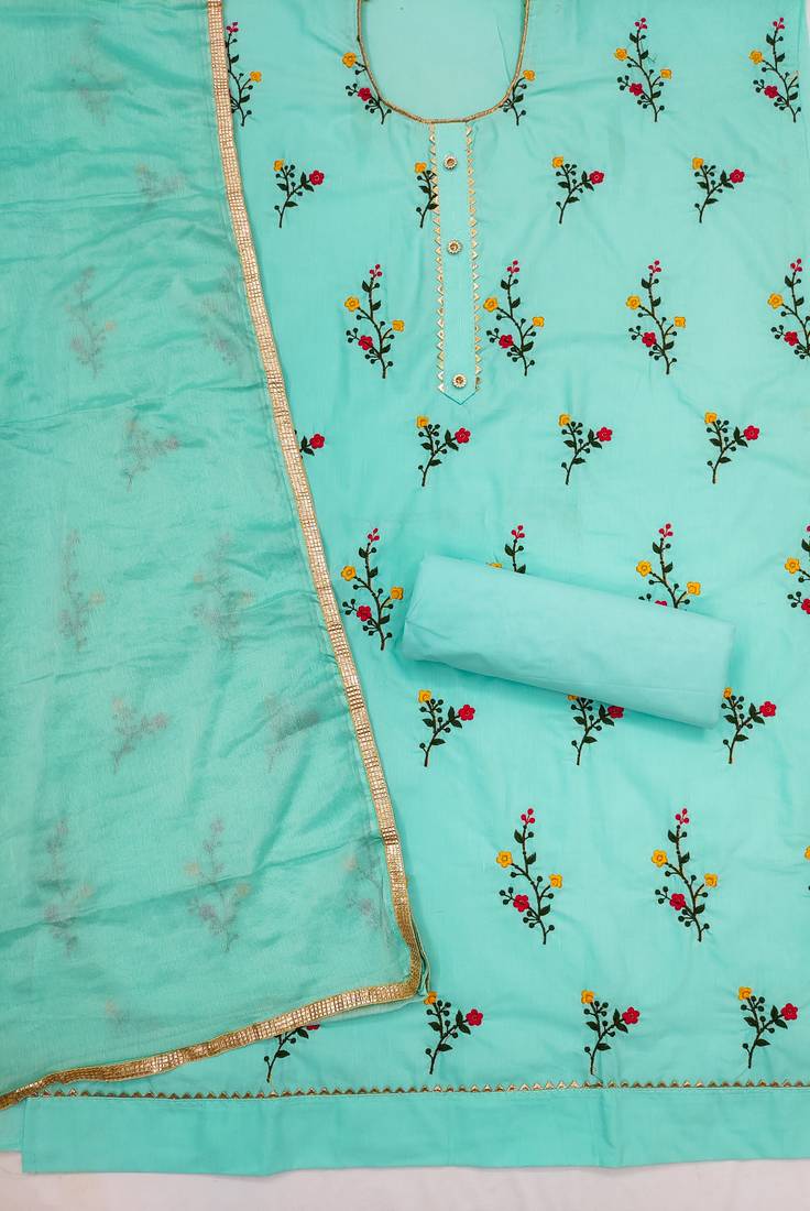 | Product Description | Our Exclusive Dress Material Suit For Women Combines Opulent Chanderi Silk With Intricate White Cotton Dhaga Embroidery And Galla Work, Offering Both Elegance And Comfort With Generous Cuts Of Heavy Micro Crape For The Bottom And Inner. Complete Your Look With A Chanderi Silk Cotton Dupatta Featuring Dhaga Work Border Details, All In A Versatile Free Size Design Fitting Up To 42 Inches, Making It The Ultimate Choice For A Blend Of Tradition And Contemporary Style At Weddings, Festivals, And Special Events. |