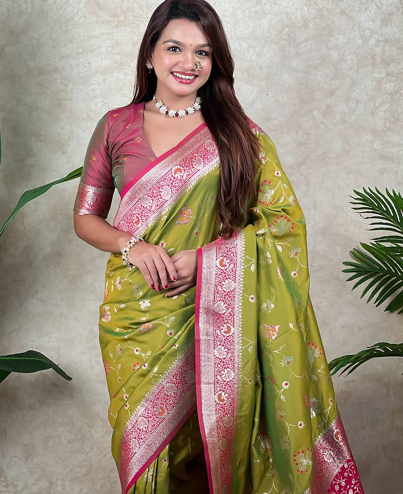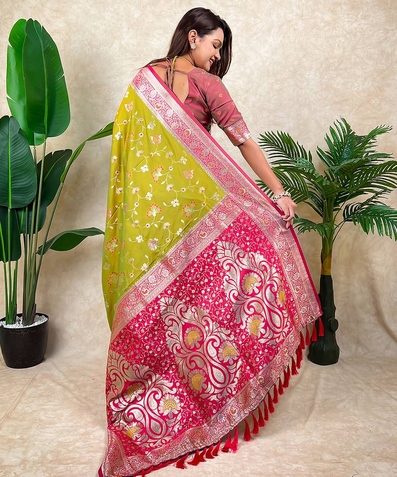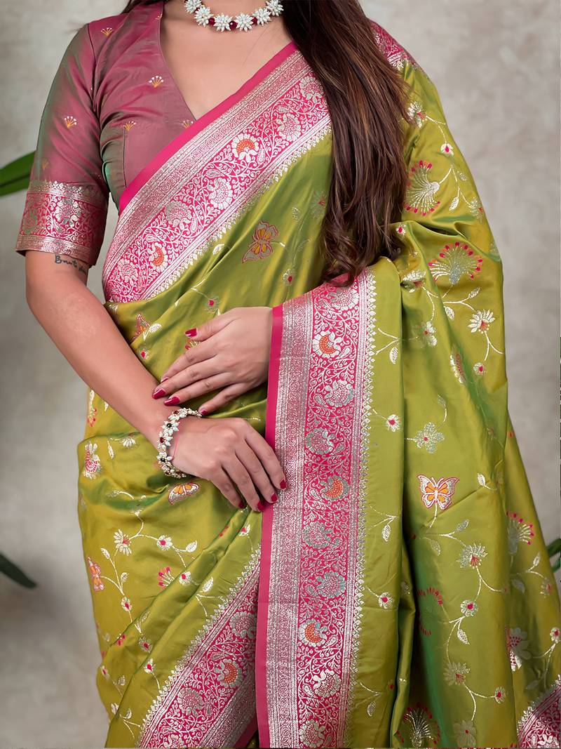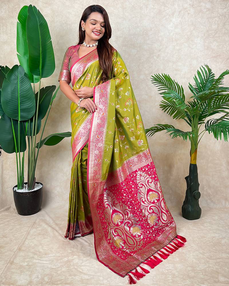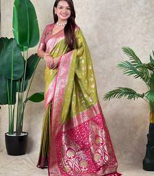 Green banarasi silk zari woven saree with contrast blouse piece