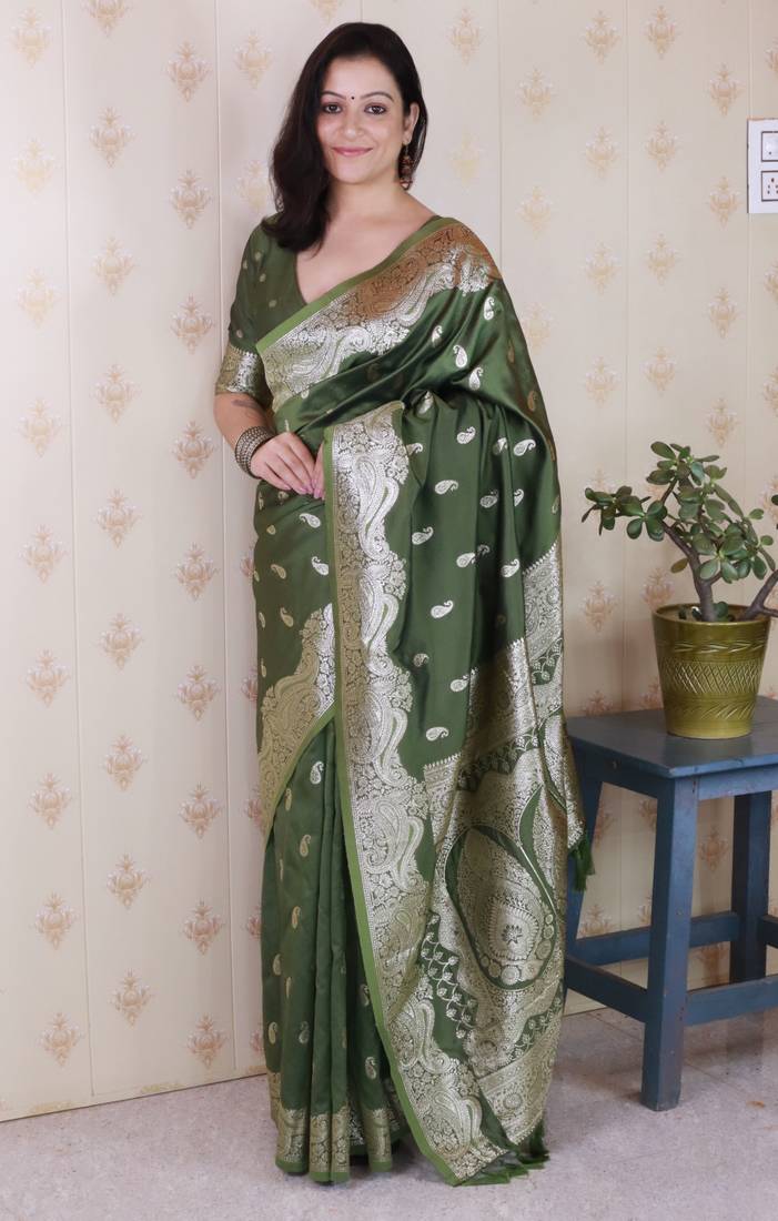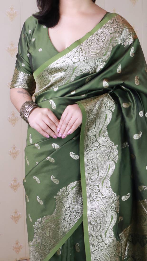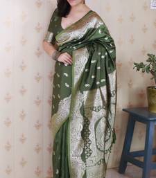 Green banarasi silk zari woven saree with matching blouse piece
