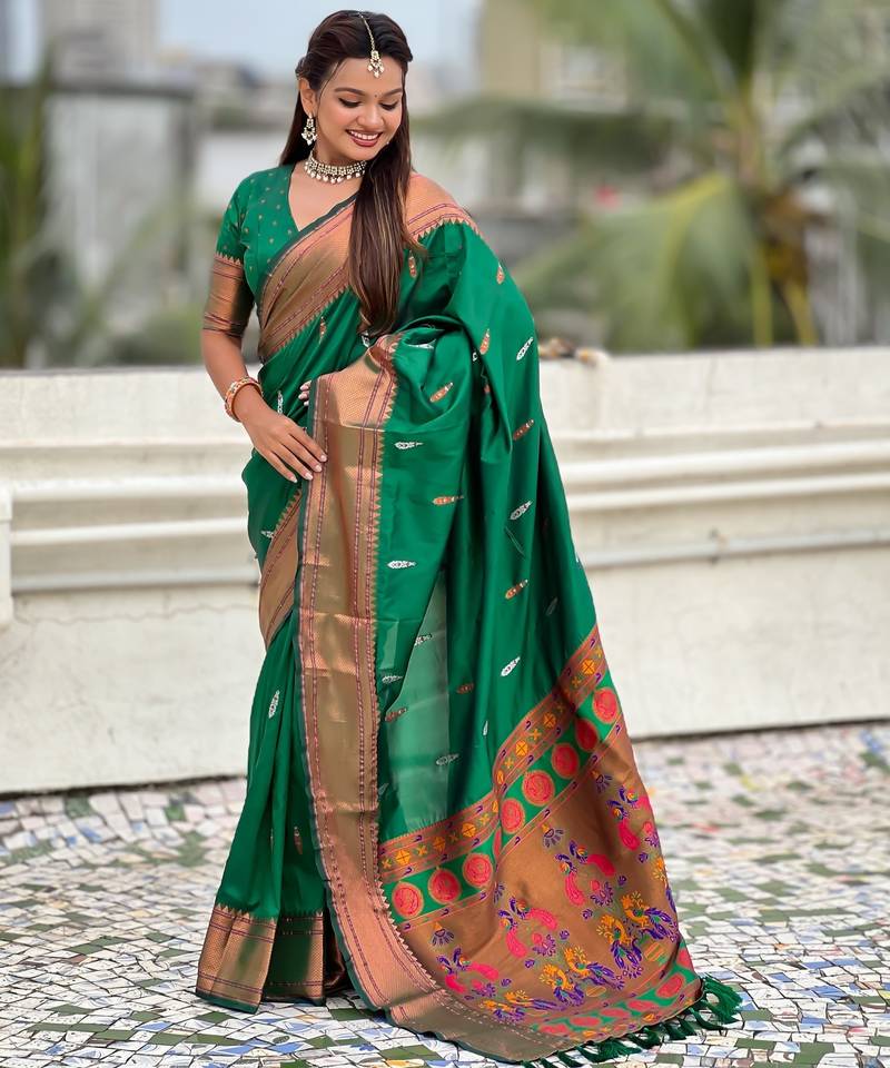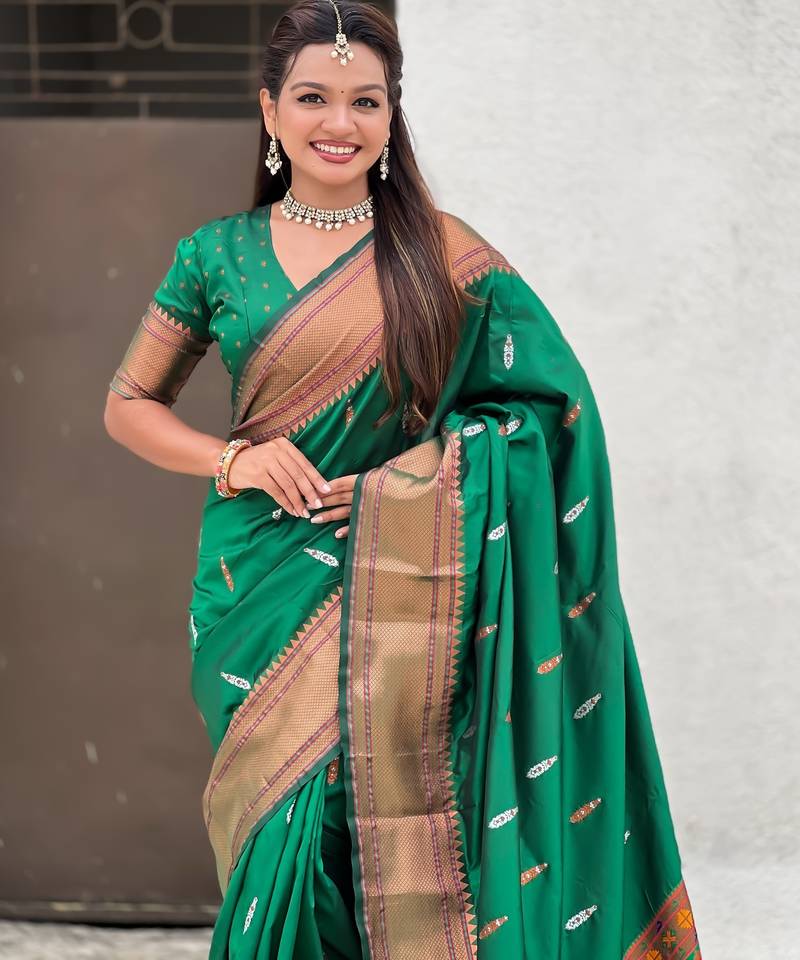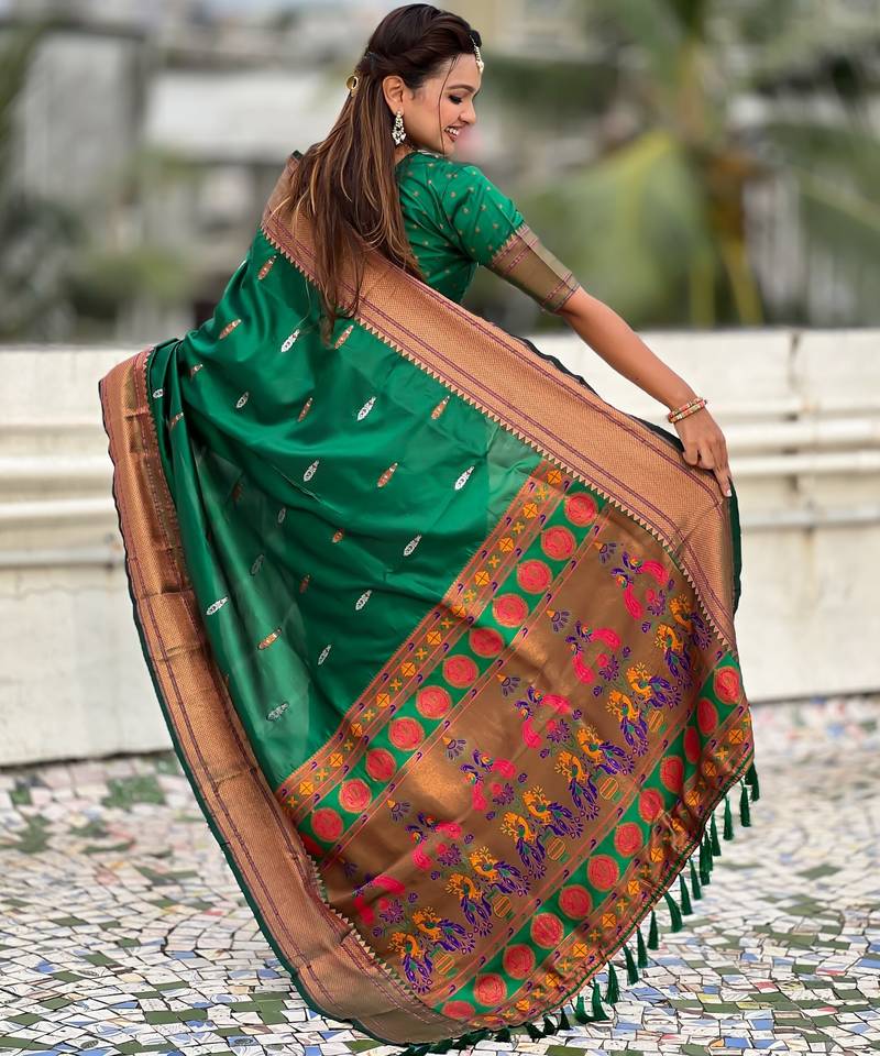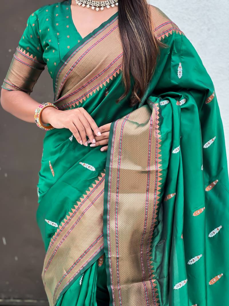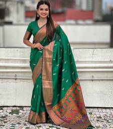 Green soft paithani silk zari weaving saree with matching blouse piece