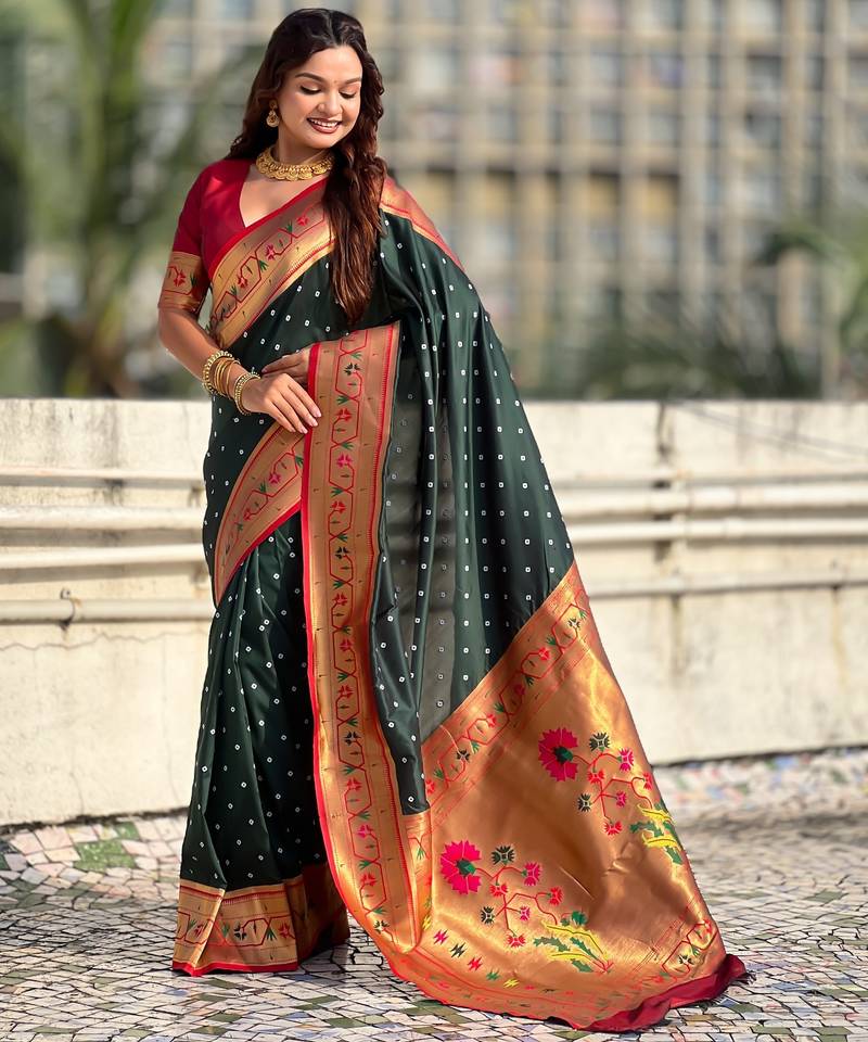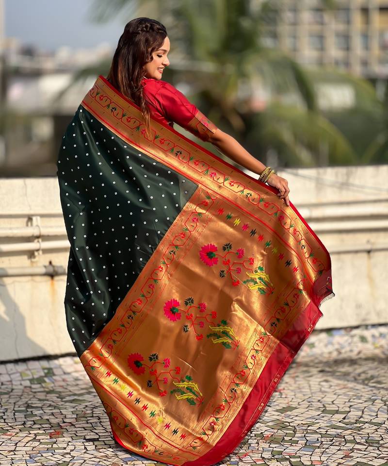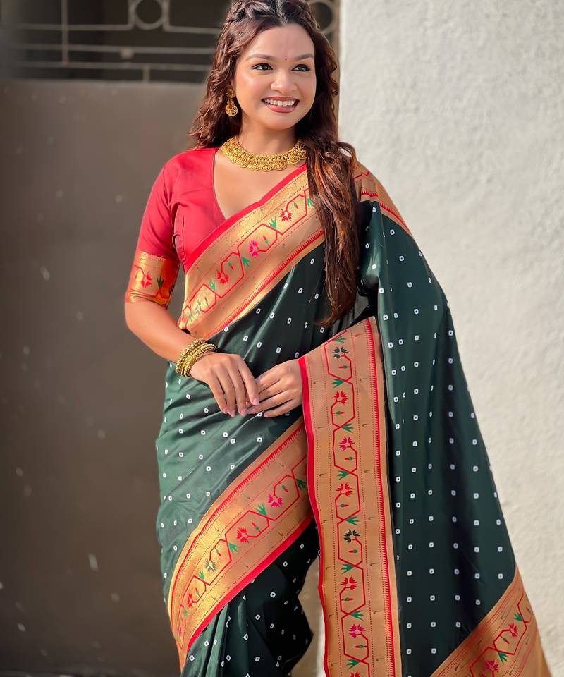 | Product Description | Soft Silk Sarees With Bandhani Zari Woven Motifs All Over The Body Having Rich Woven Paithani Meenakari Pallu And Paithani Simple Contrast Border Paired With Plain Contrast Blouse Same As |