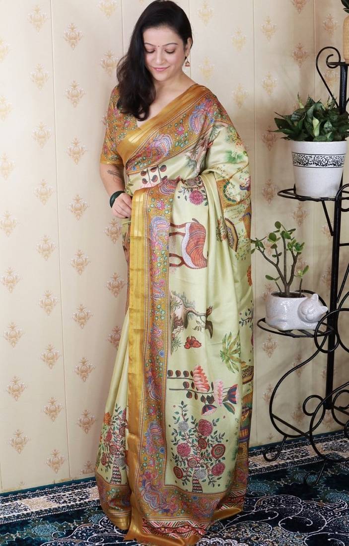 | Product Name | Green Tussar Silk Kalamkari Print Zari Woven Border Saree With Contrast Blouse Piece | |