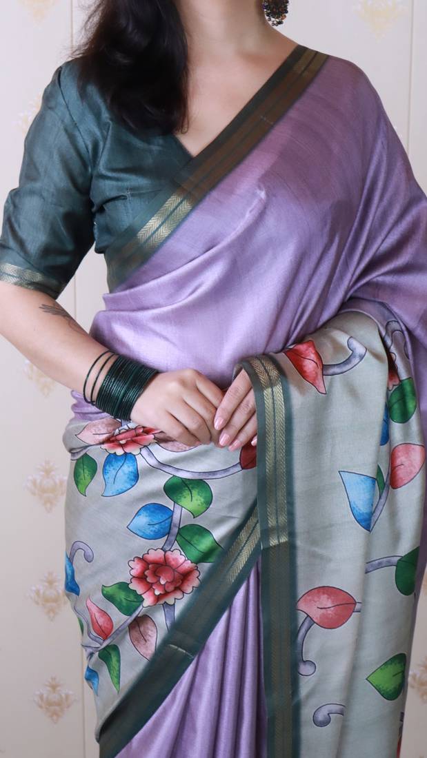 Lavender tussar silk kalamkari print zari woven border saree with contrast blouse piece