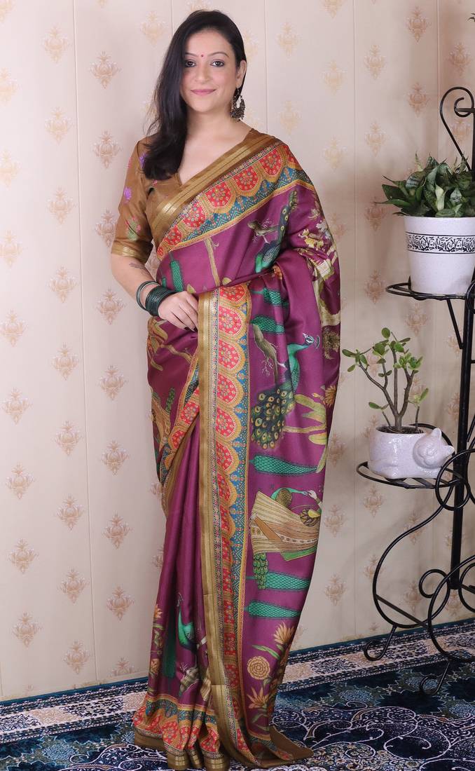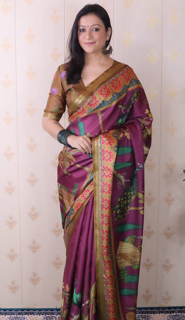 | Product Description | Step Into Elegance With This Soft Tussar Silk Saree, Designed To Reflect The Rich Legacy Of Indian Textile Art. The Saree Features Traditional Indian Heritage Prints Spread Gracefully Across The Body, Giving It A Timeless Ethnic Appeal. |