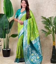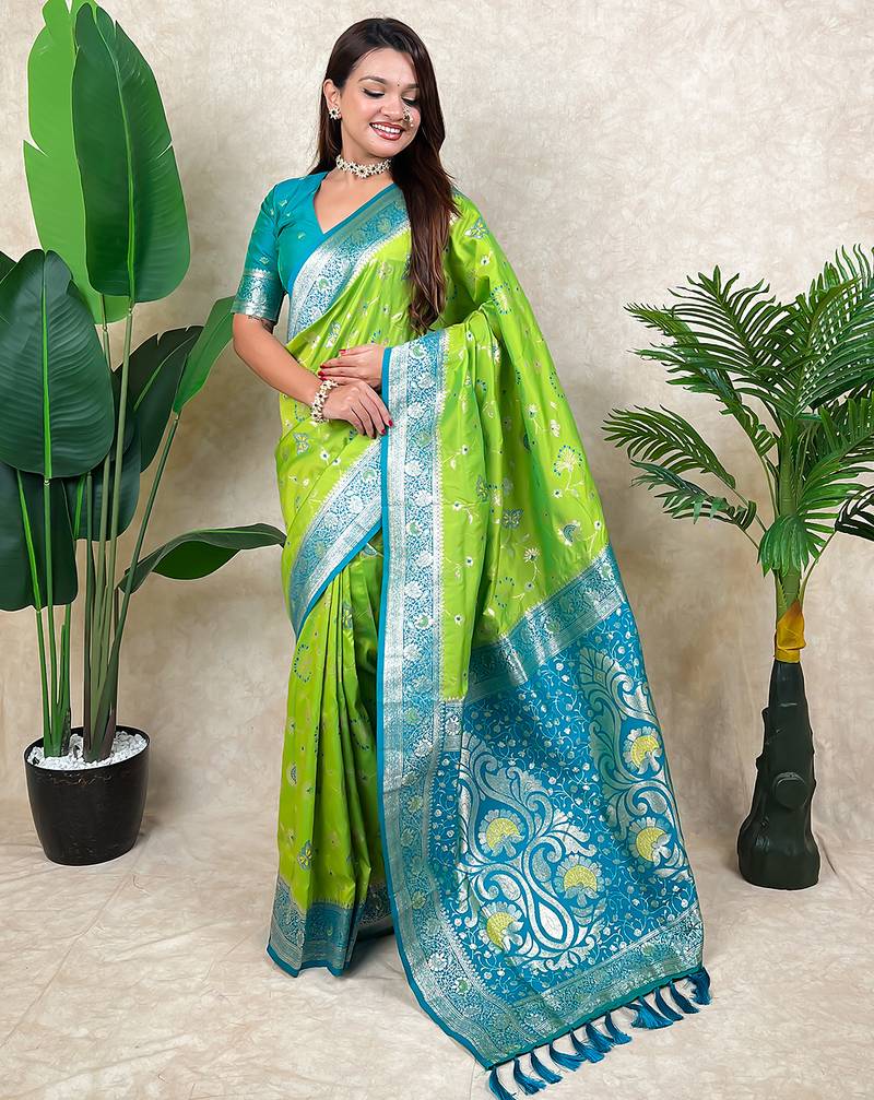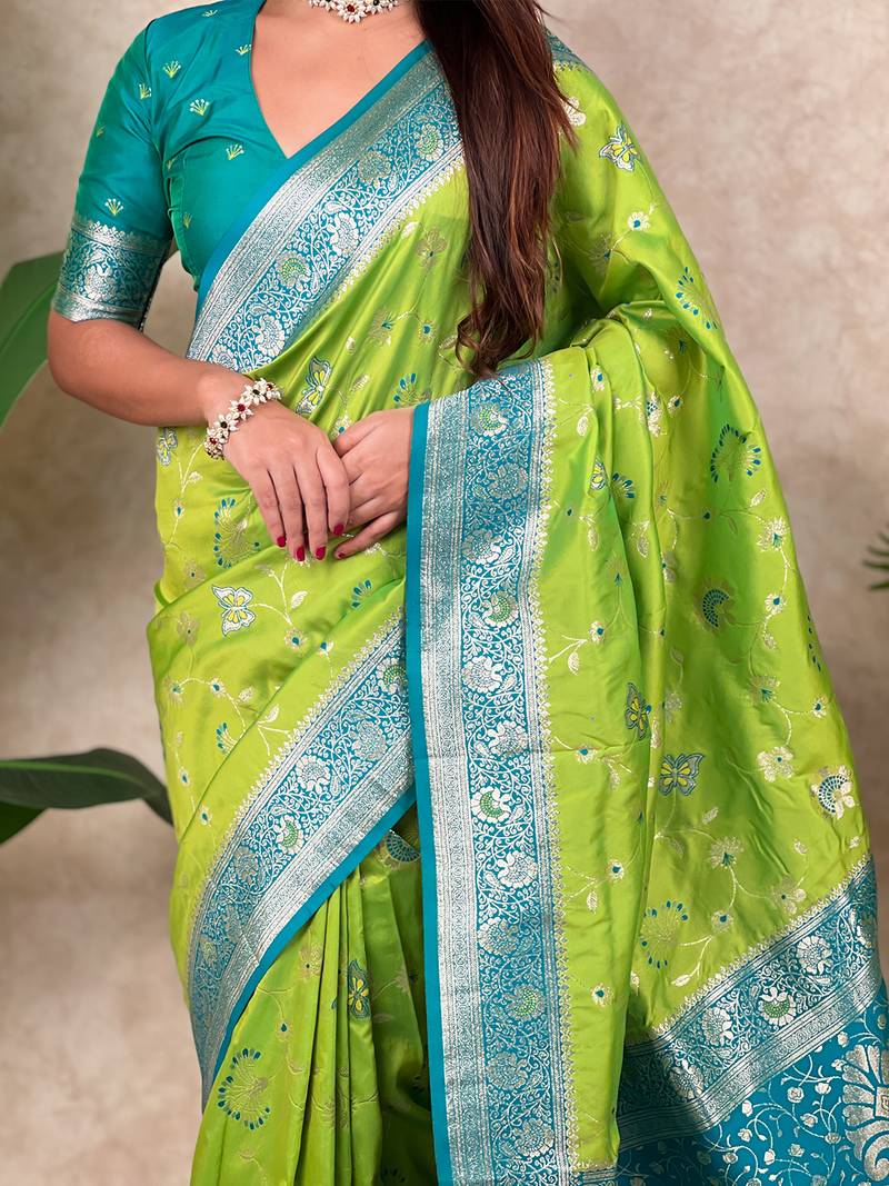 Light green banarasi silk zari woven saree with contrast blouse piece
