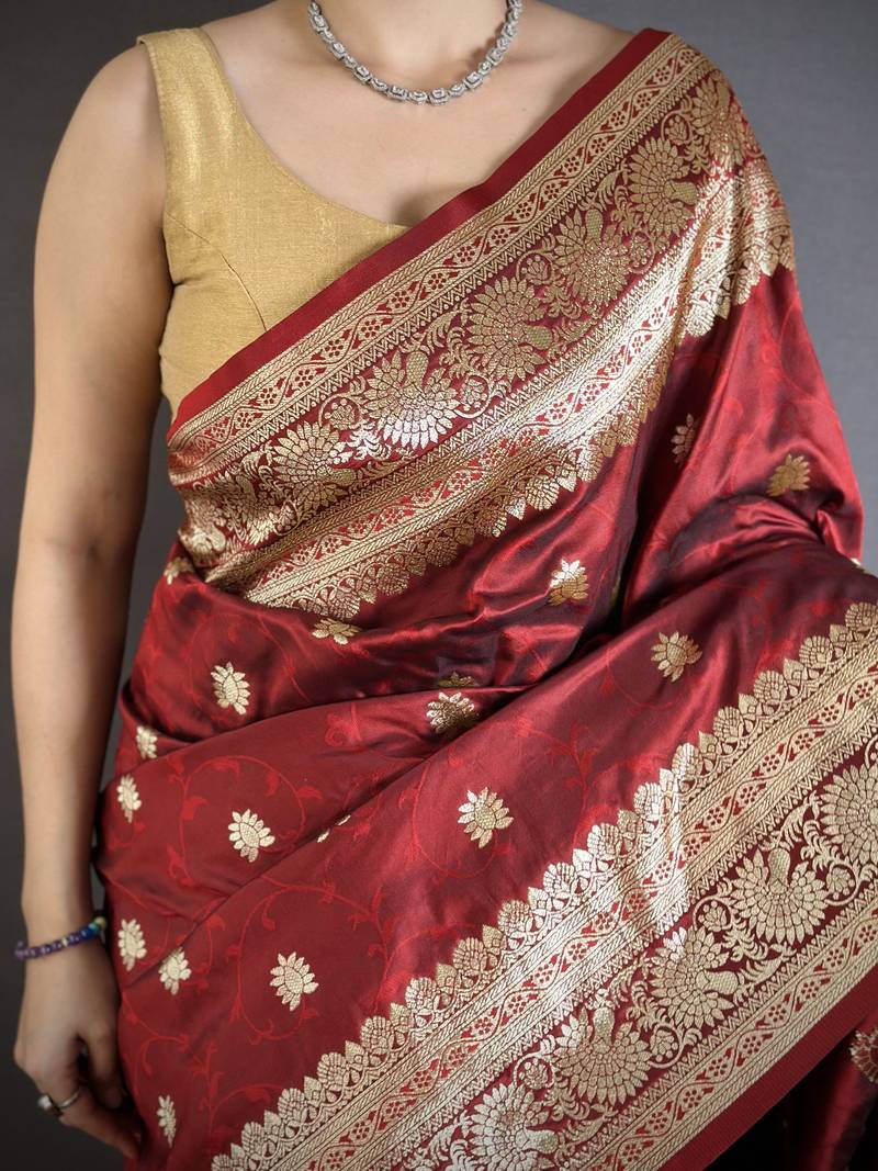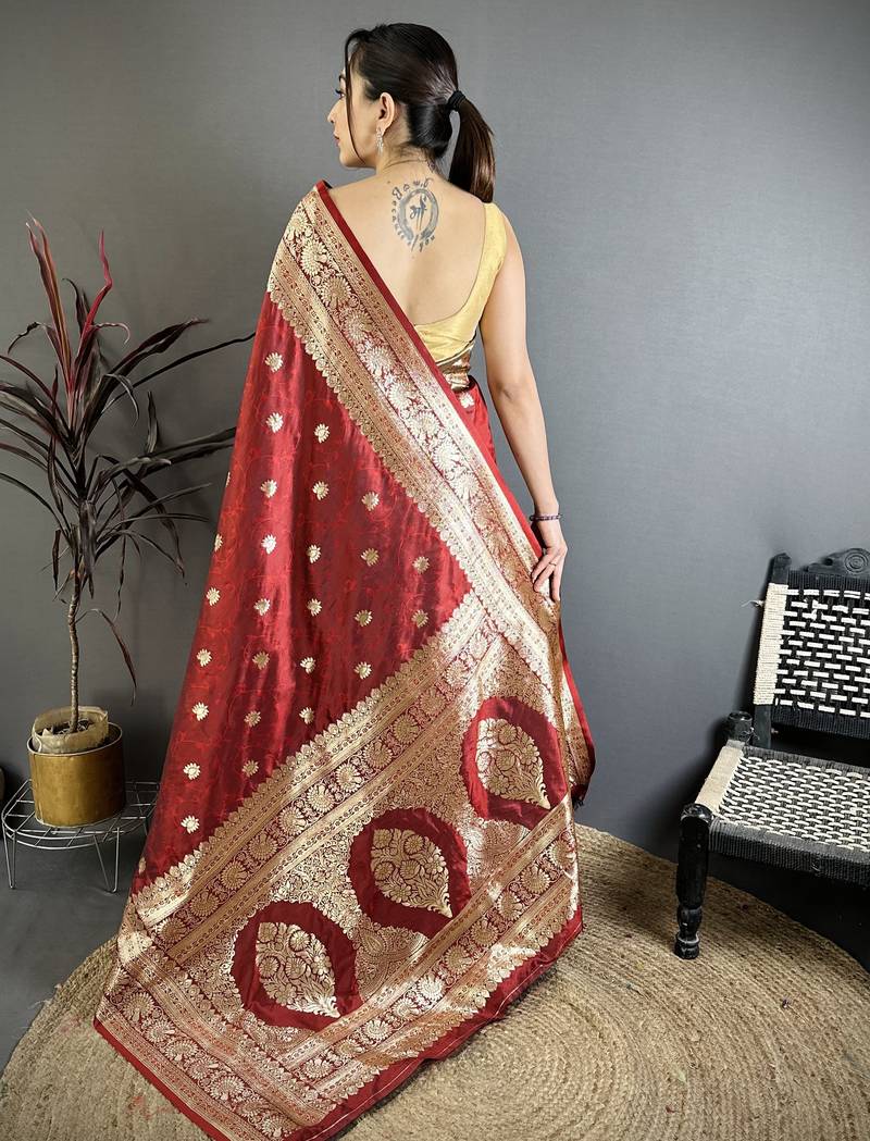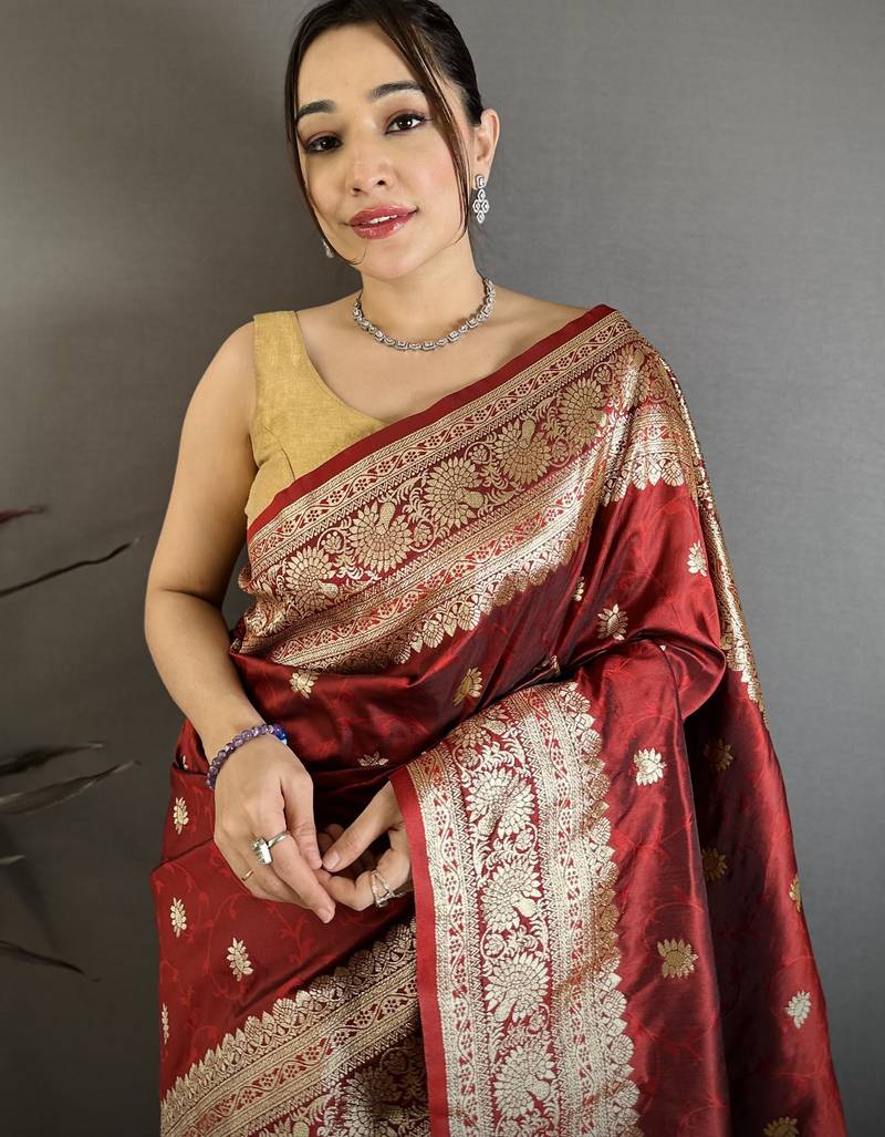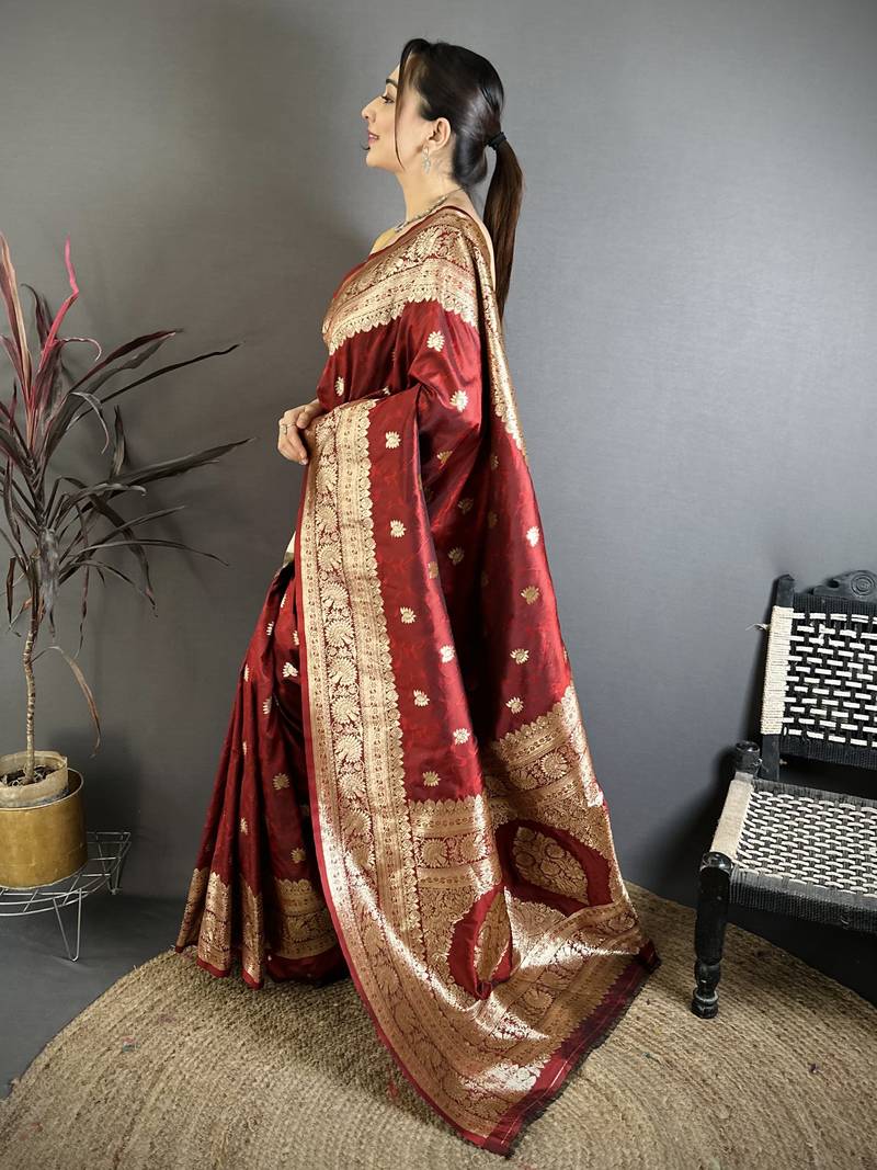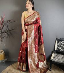 Maroon soft banarasi silk zari weaving saree with matching blouse piece