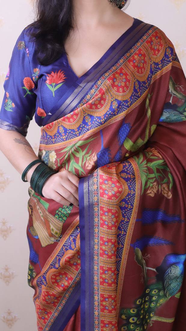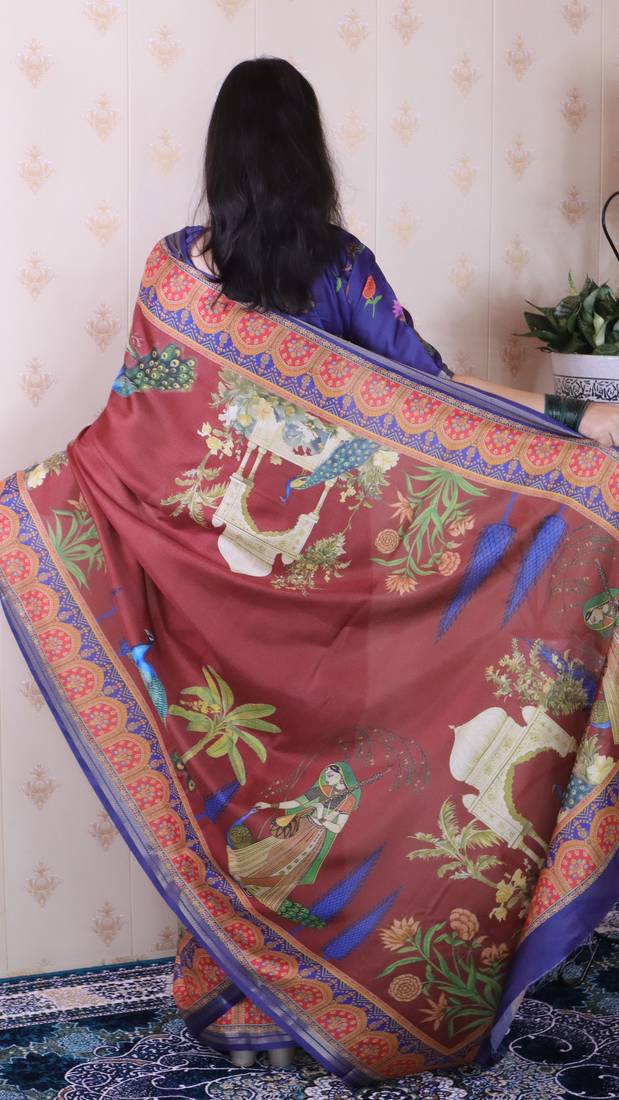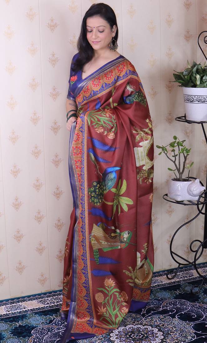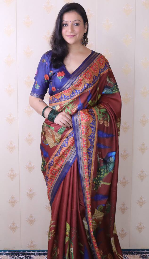 | Product Name | Maroon Tussar Silk Printed With Zari Border Saree And Contrast Blouse Piece | |
