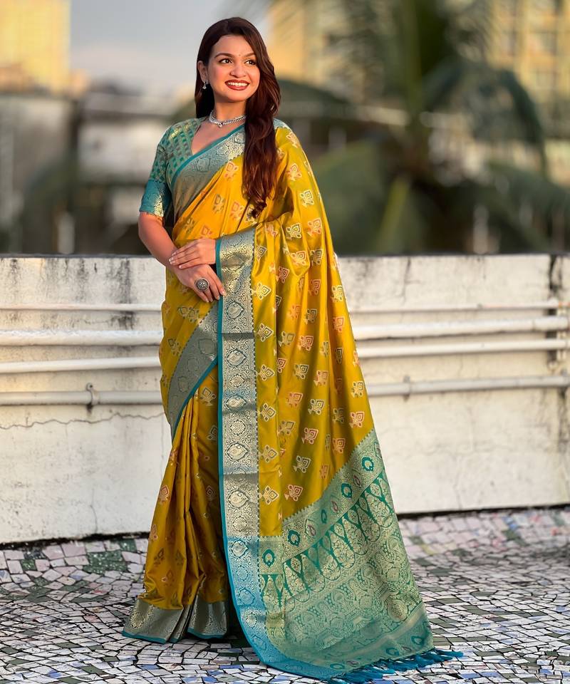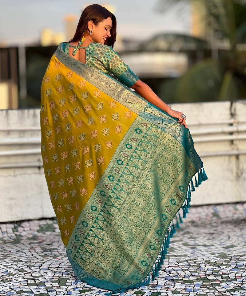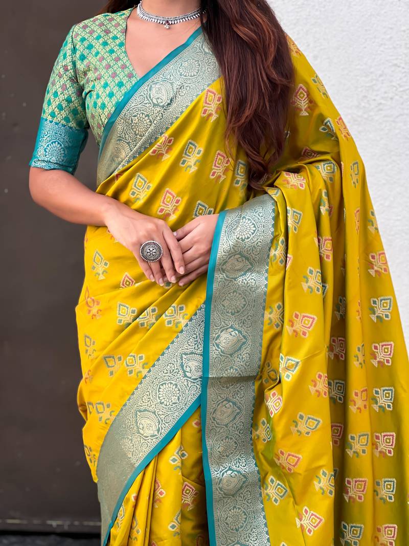 Mustard patola silk saree meenakari weaves & zari pallu with contrast blouse piece