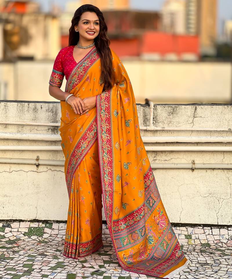 Mustard viscose silk position print & zari weaving saree with contrast blouse piece