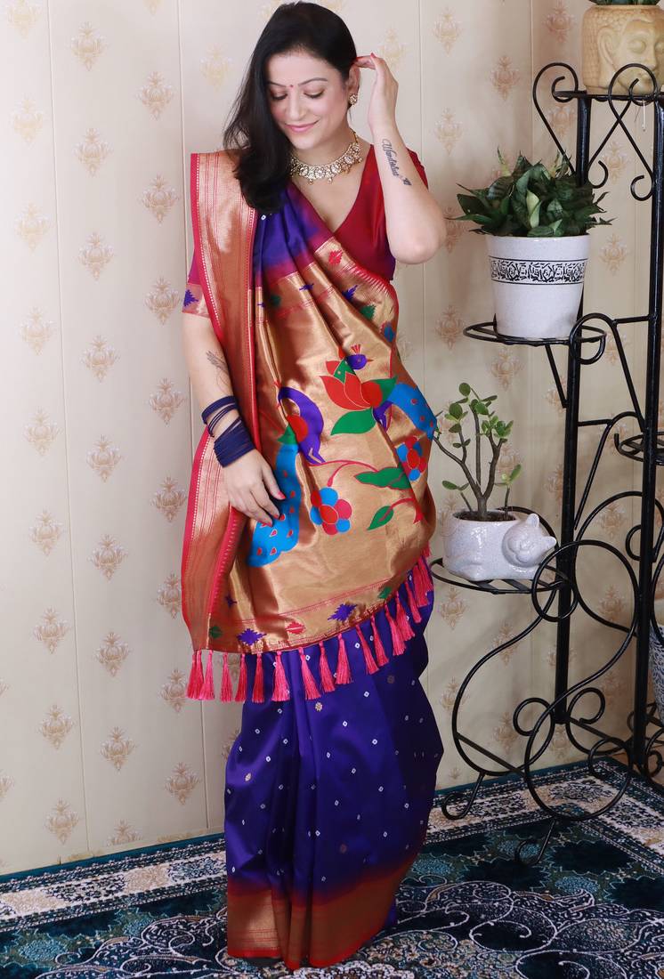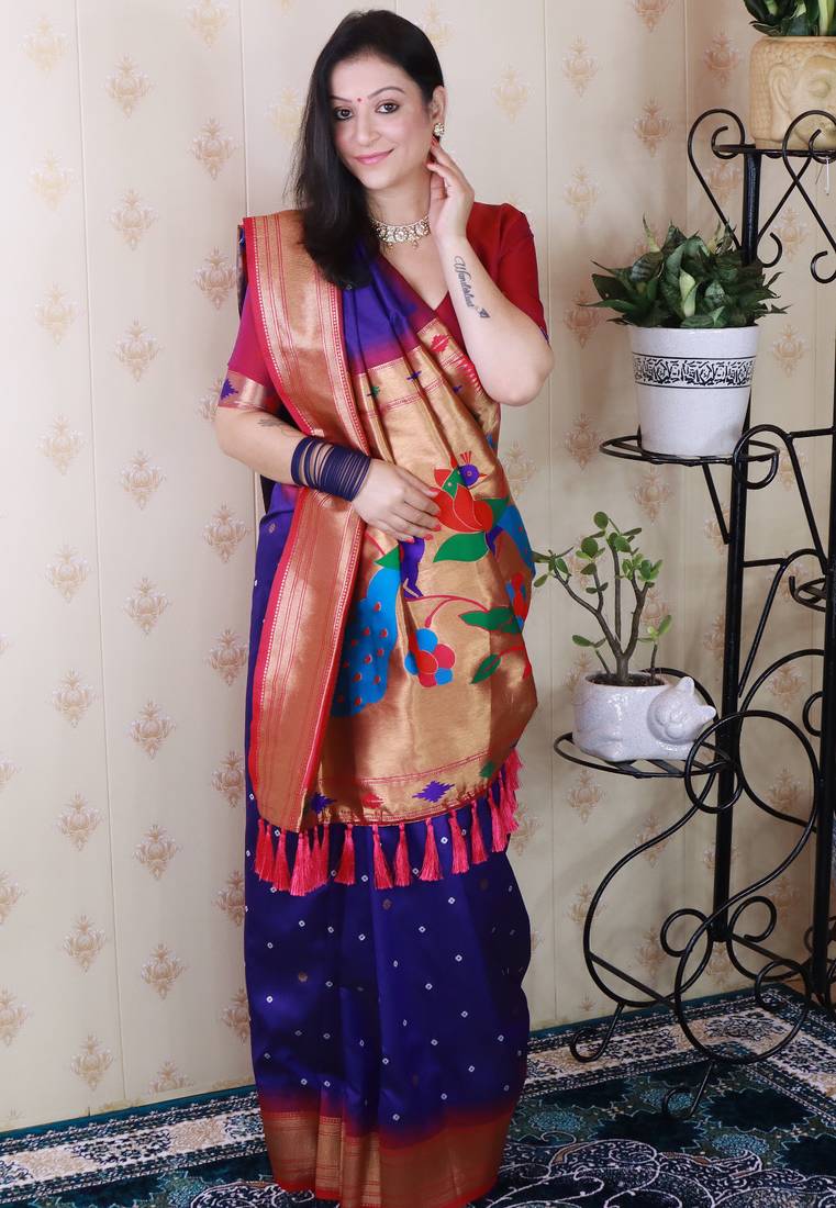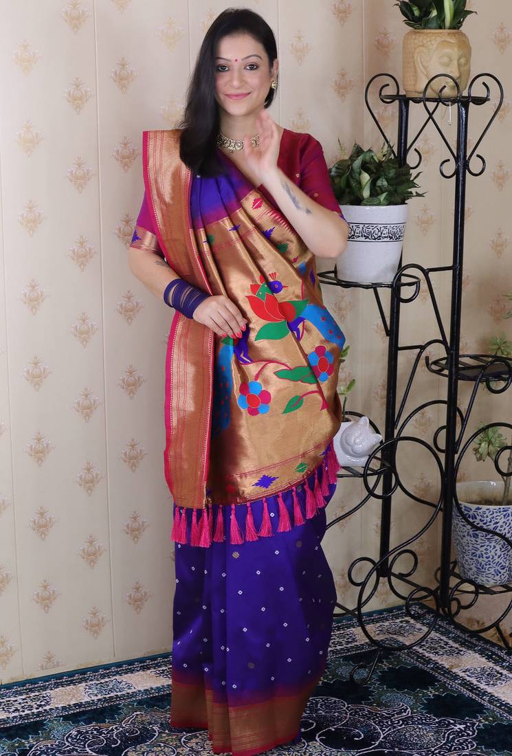 | Product Name | Navy Blue Paithani Silk Bandhani Zari Weaving Saree With Contrast Blouse Piece | |