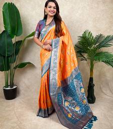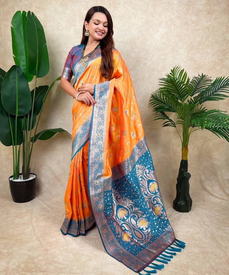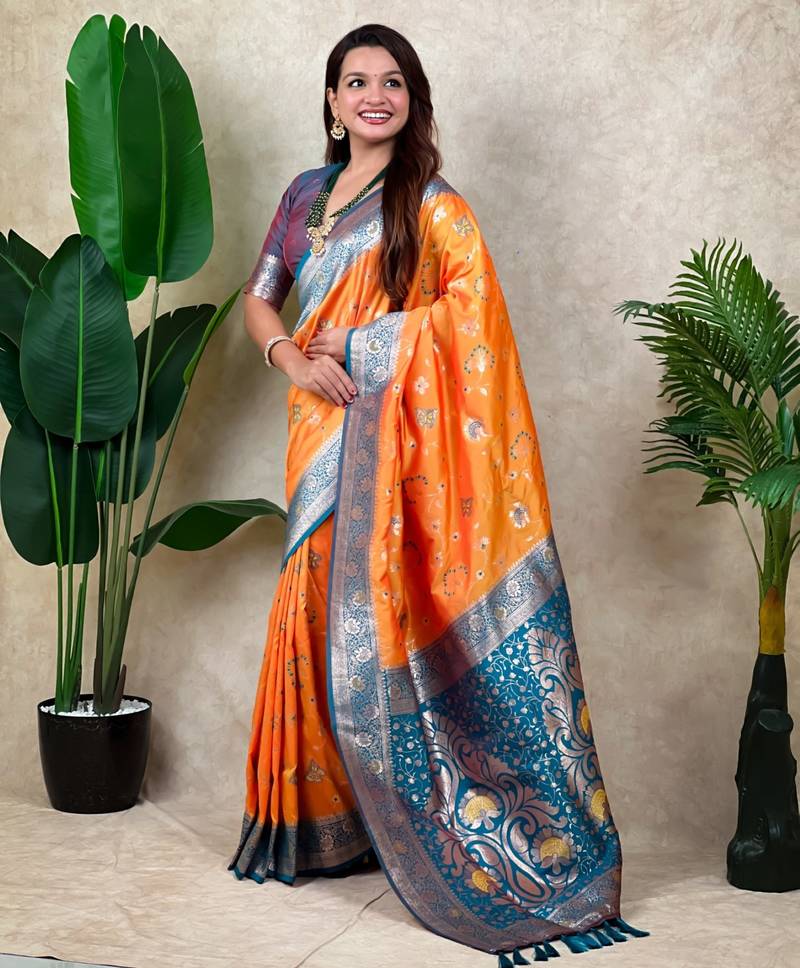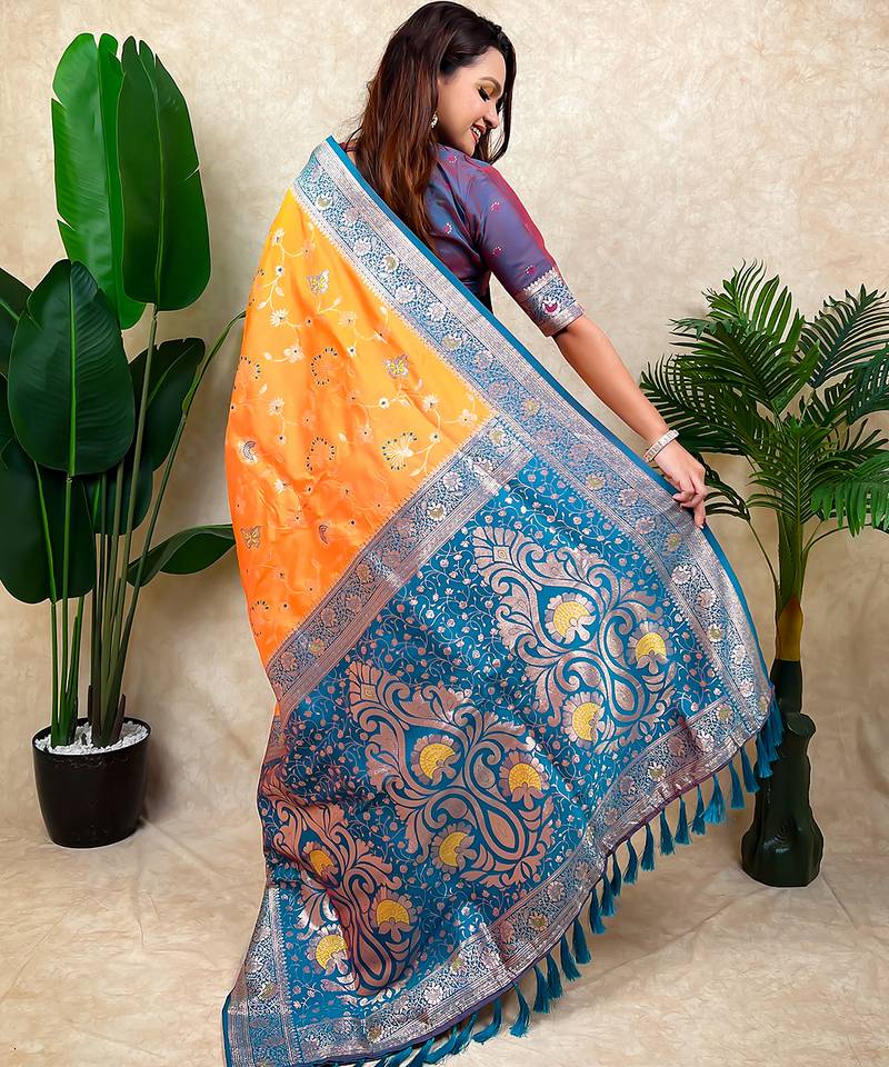 Orange banarasi silk zari woven saree with contrast blouse piece
