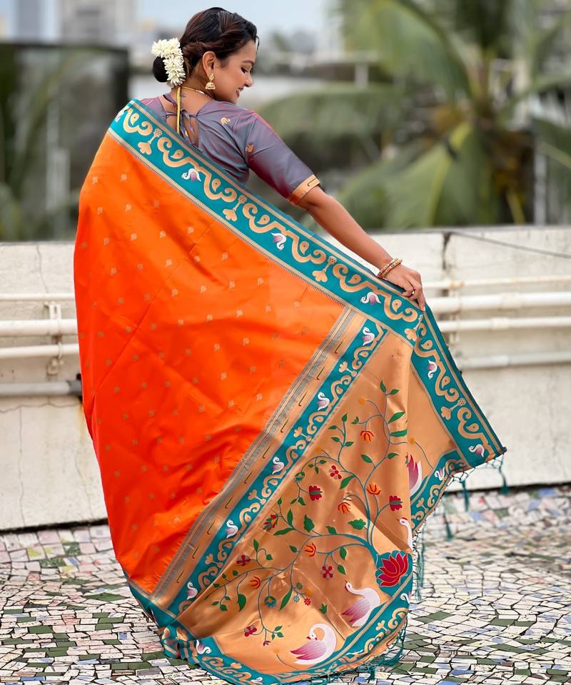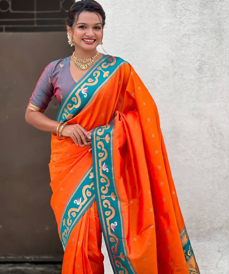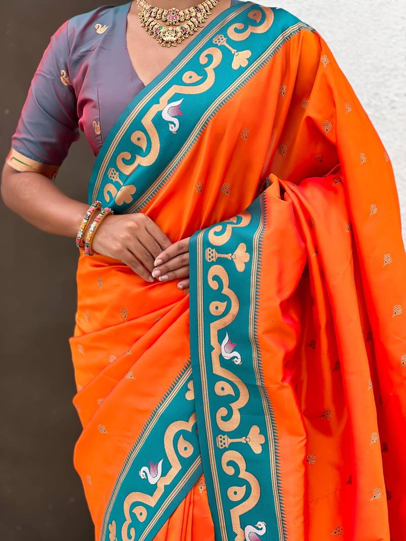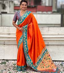 Orange paithani silk zari weaving saree with contrast blouse piece