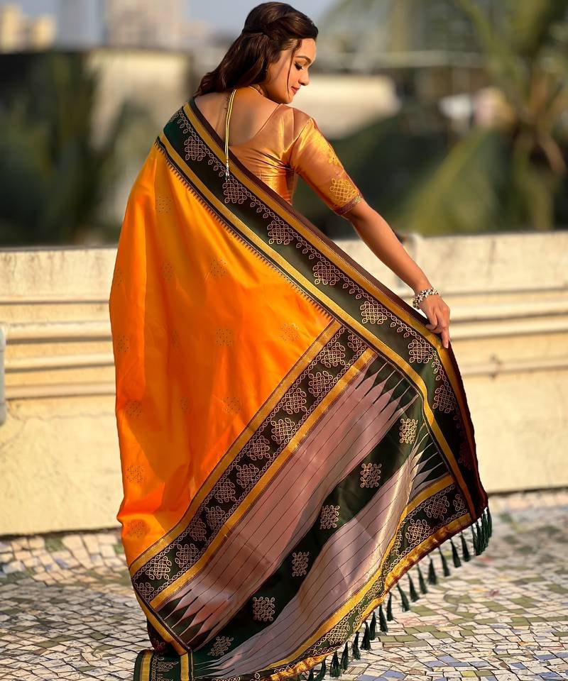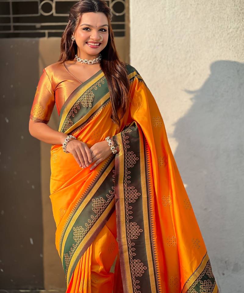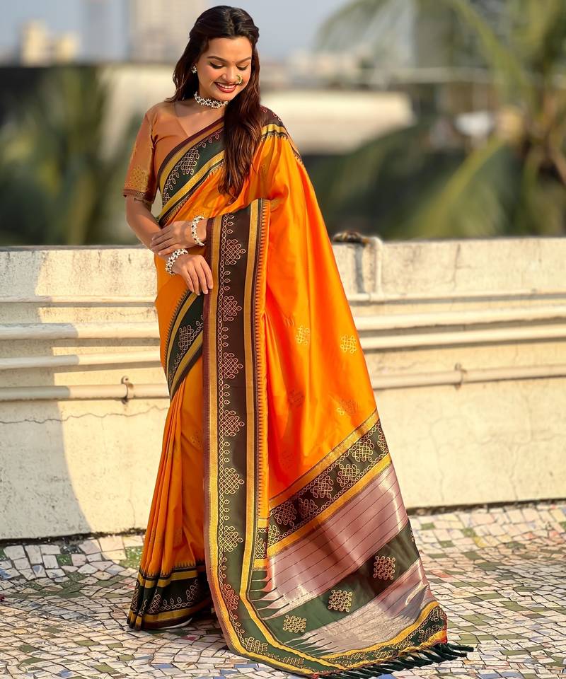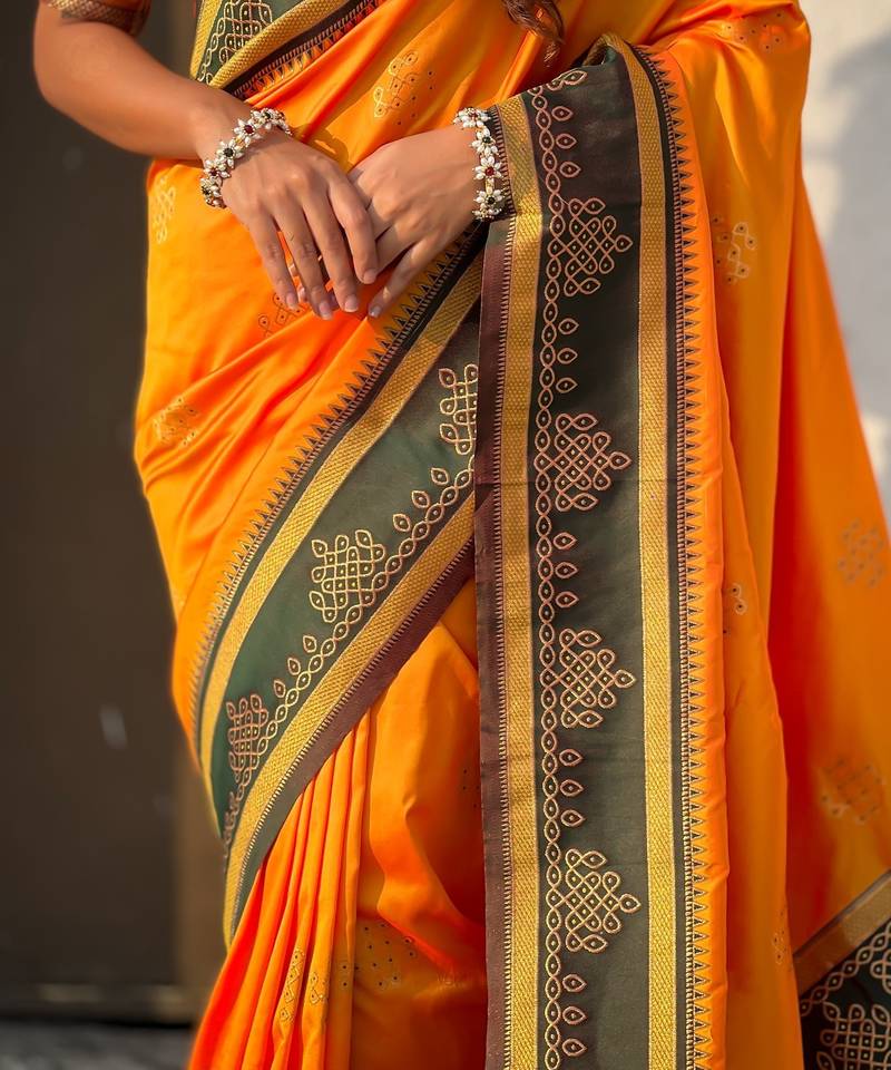 Orange soft silk rangoli art zari weaving saree with contrast blouse piece