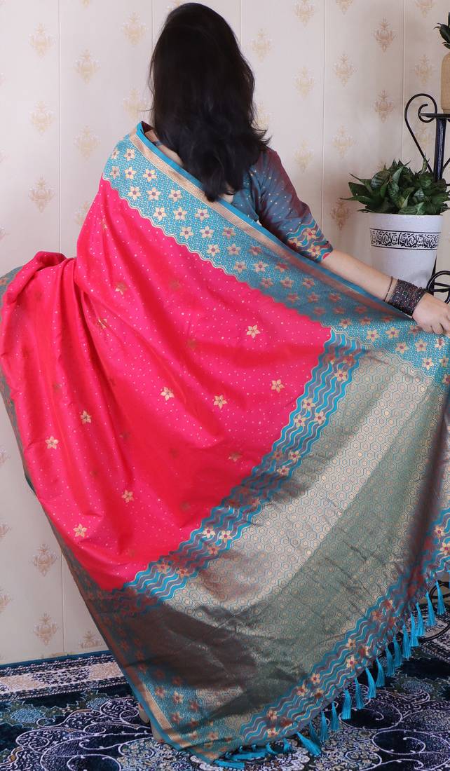 Pink banarasi silk zari weaving saree with contrast blouse piece