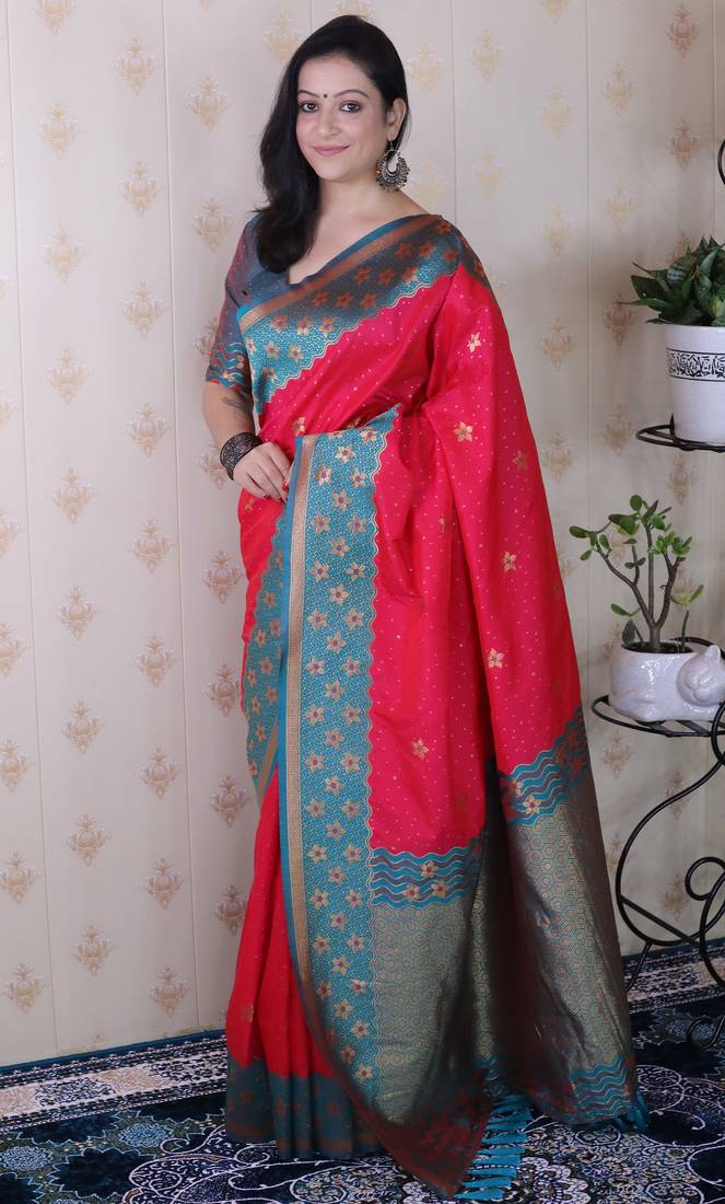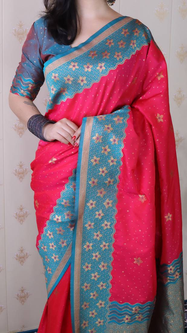| Product Description | Step Into Timeless Elegance With This Premium Banarasi Soft Silk Saree, Exquisitely Woven With Gold Zari Floral Motifs All Over The Body, Giving It A Royal And Traditional Appeal. |