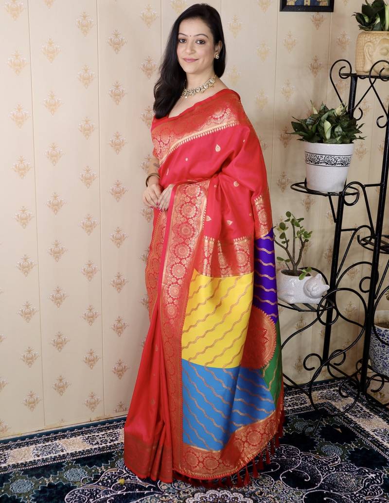| Product Description | Premium Banarasi Soft Silk Sarees With Gold Zari Motifs All Over The Body, Having Rich Zari Woven Rangkaat Multicolor Pallu And Paired With Brocade Running Blouse |