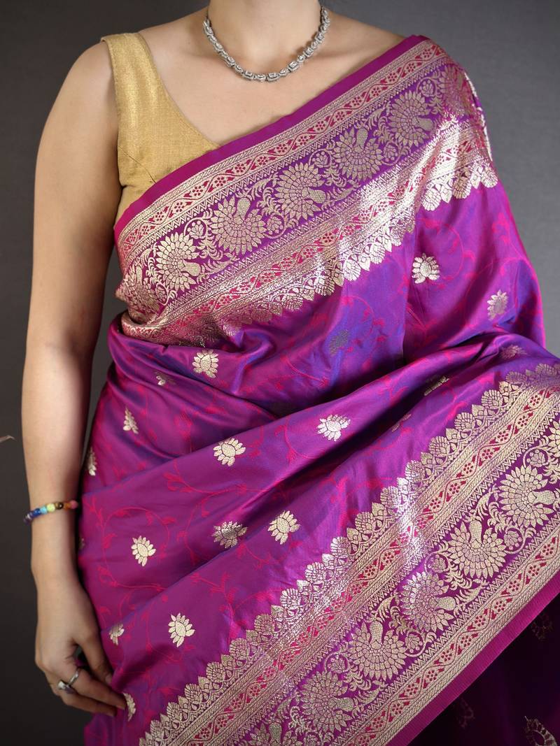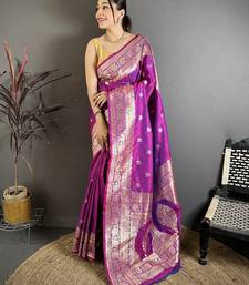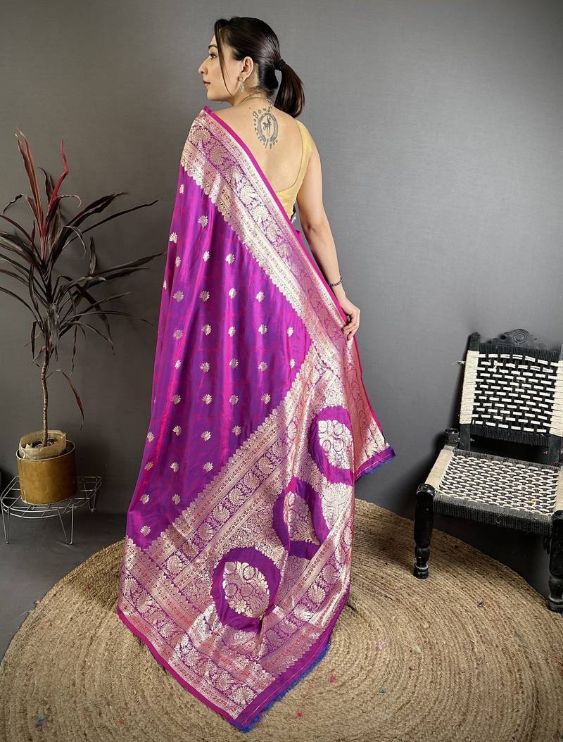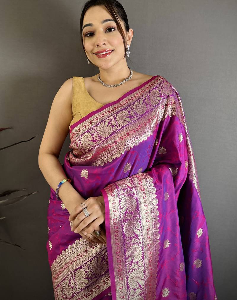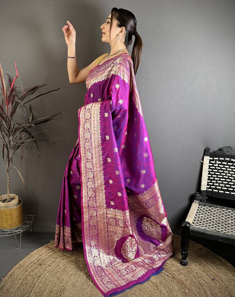 | Product Description | Enhance Your Traditional Wardrobe With This Elegant Purple Banarasi Silk Blend Saree Designed With Intricate Gold Zari Weaving. The Saree Showcases Delicate Floral And Vine Motifs Spread Across The Body, Paired With A Richly Woven Border And An Ornate Pallu That Reflects Classic Banarasi Craftsmanship. Its Luxurious Fabric Offers A Graceful Drape And A Subtle Sheen, Making It Perfect For Weddings, Festive Occasions, And Cultural Celebrations. The Stunning Combination Of Deep Purple And Golden Zari Creates A Royal And Sophisticated Appearance. This Saree Comes With A Matching Blouse Piece, Allowing You To Style It Beautifully While Embracing The Timeless Charm Of Traditional Indian Attire. |