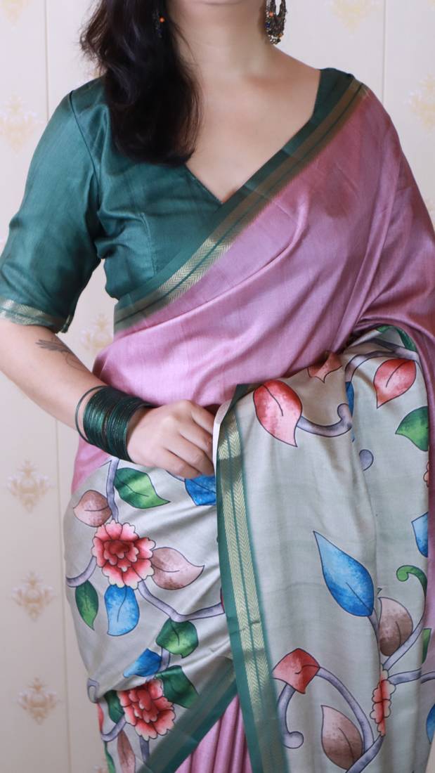Pink tussar silk kalamkari print zari woven border saree with contrast blouse piece\