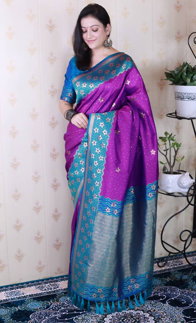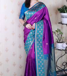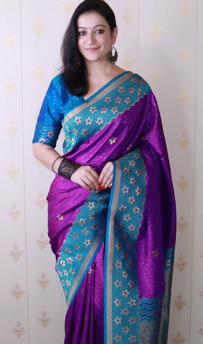 Purple banarasi silk zari weaving saree with contrast blouse piece