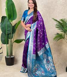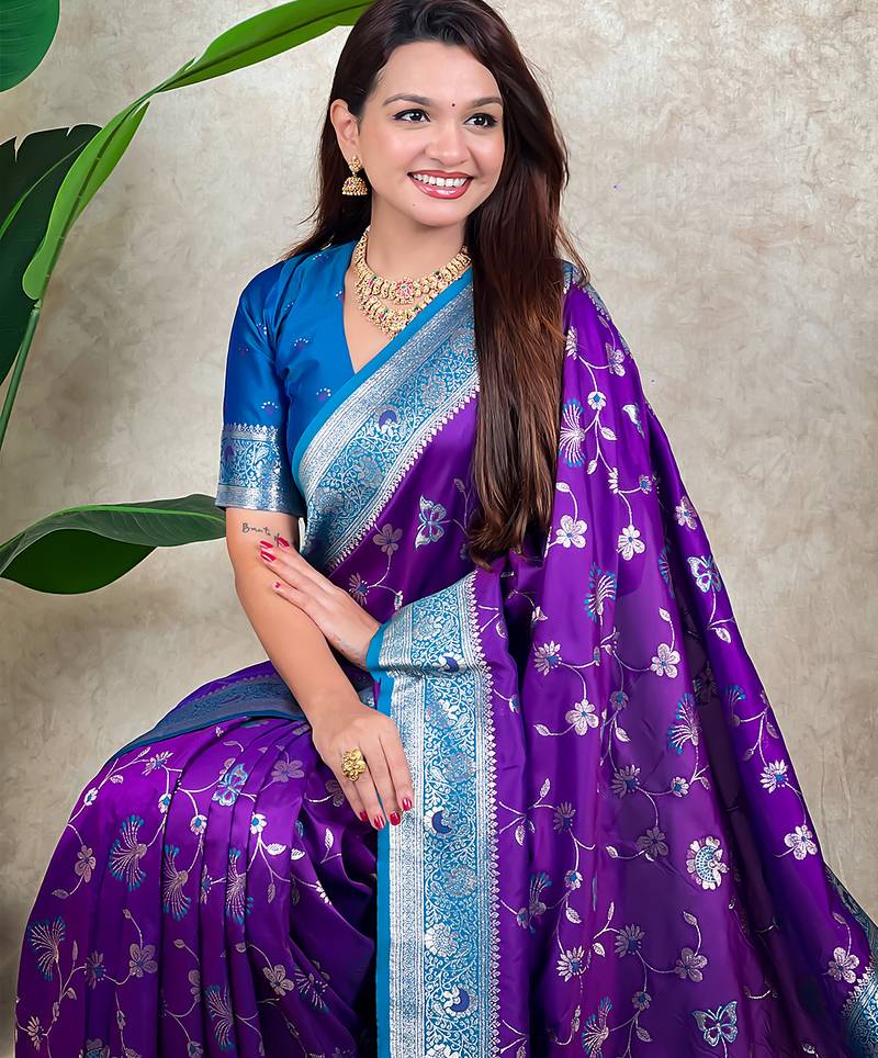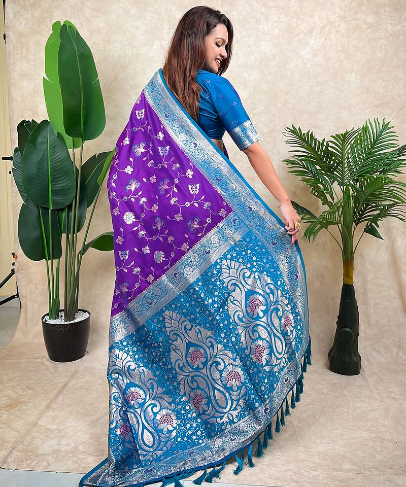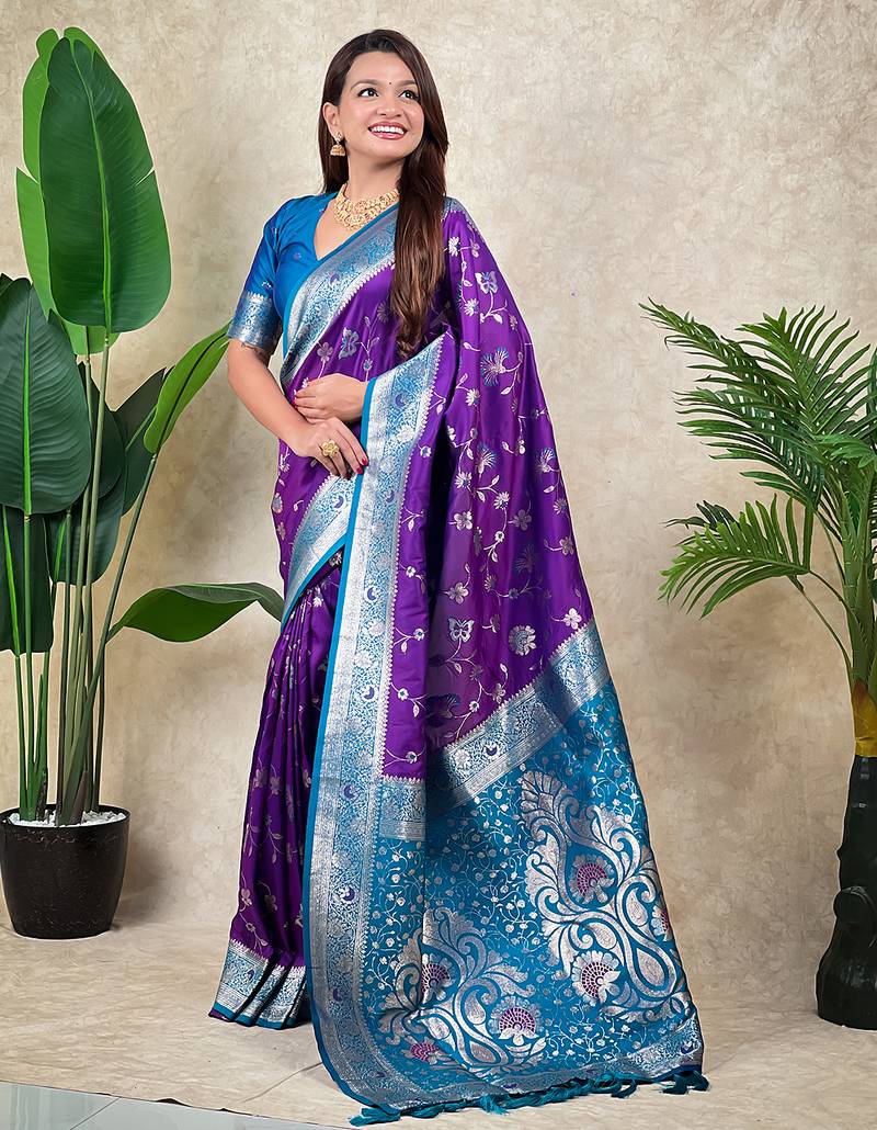 Purple banarasi silk zari woven saree with contrast blouse piece