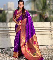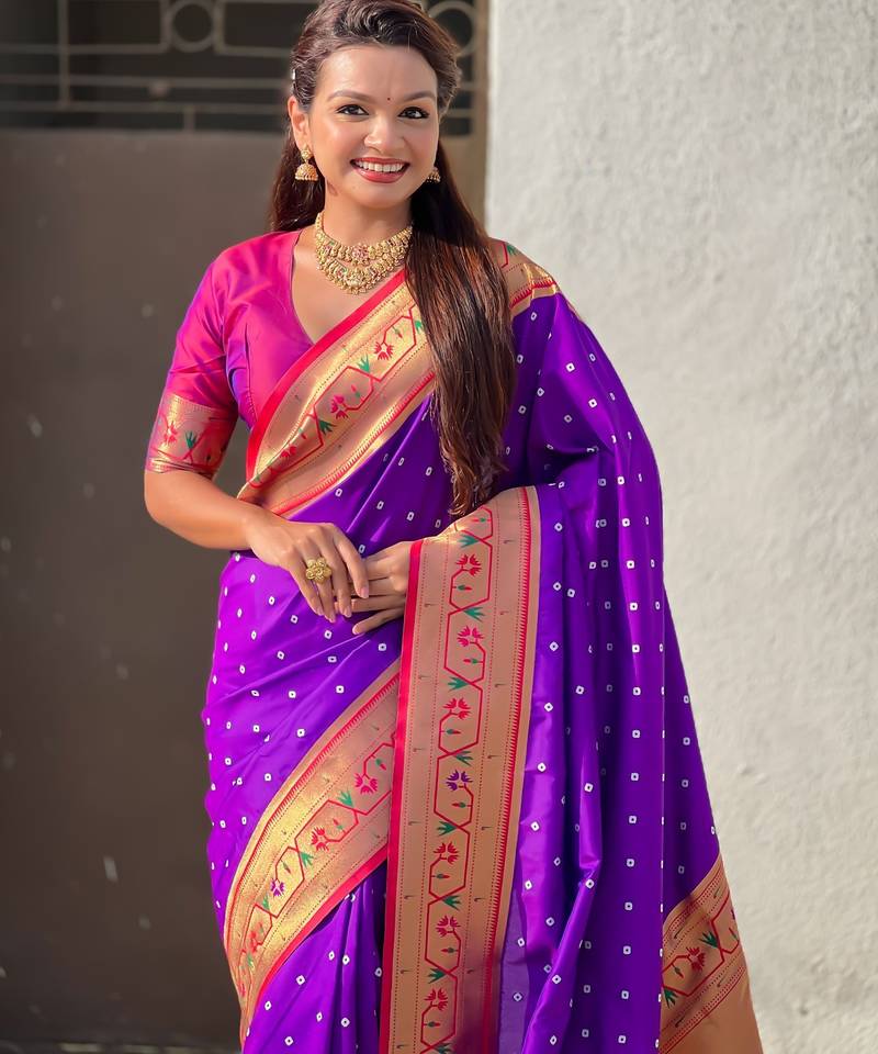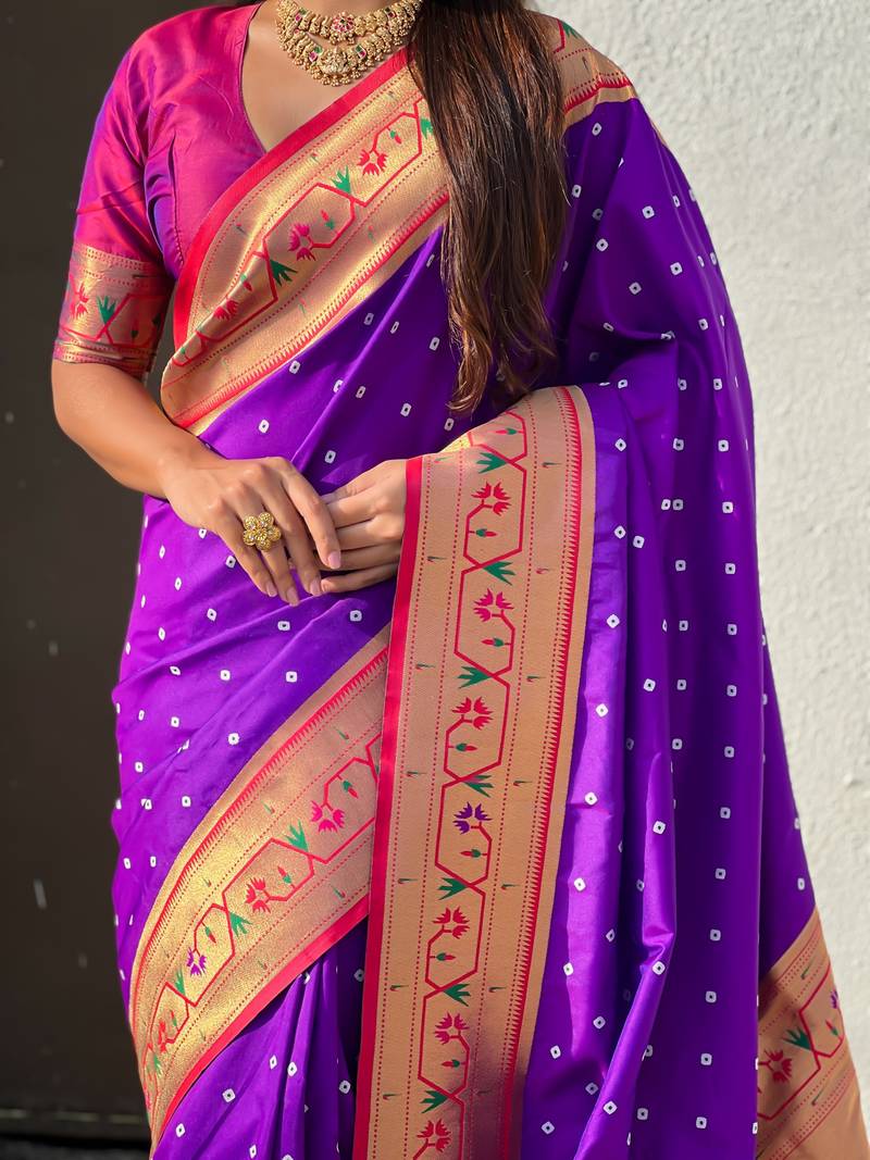 Purple soft silk bandhani zari weaving saree with contrast blouse piece