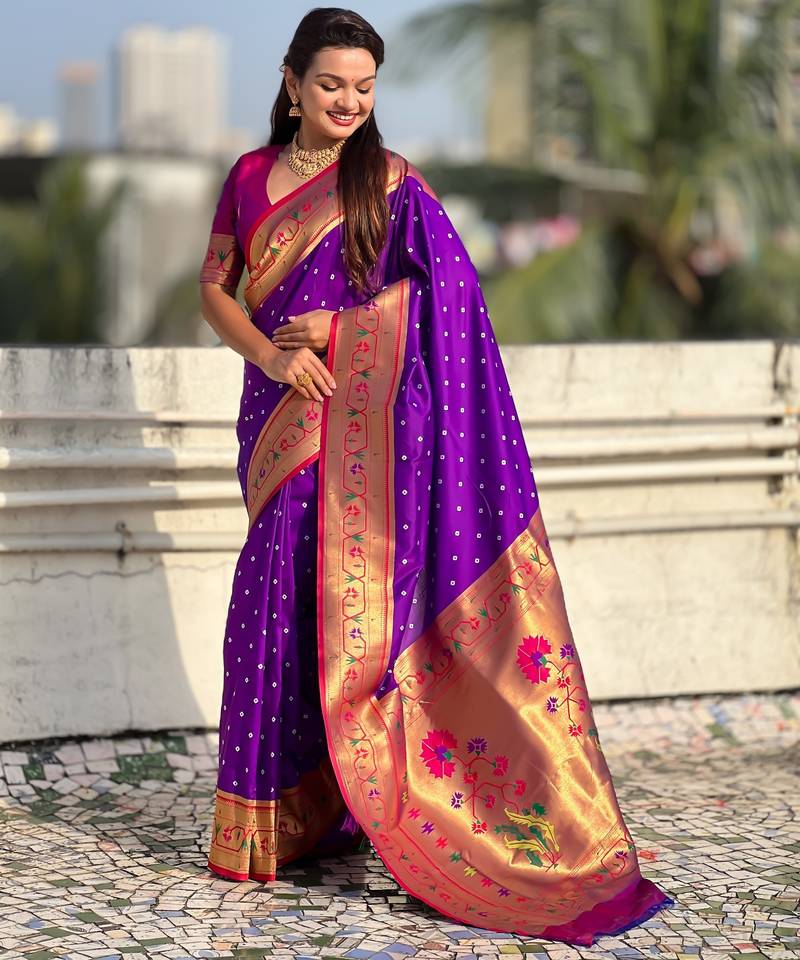 | Product Description | Soft Silk Sarees With Bandhani Zari Woven Motifs All Over The Body Having Rich Woven Paithani Meenakari Pallu And Paithani Simple Contrast Border Paired With Plain Contrast Blouse Same As |