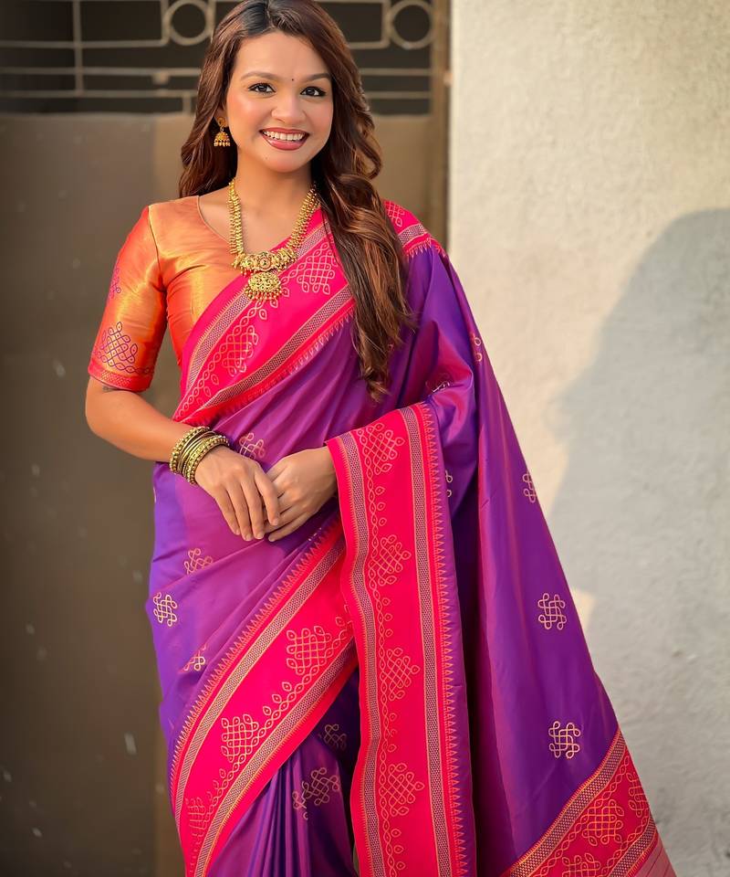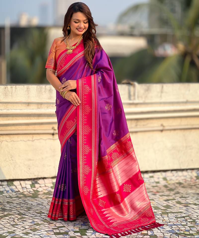 Purple soft silk rangoli art zari weaving saree with contrast blouse piece