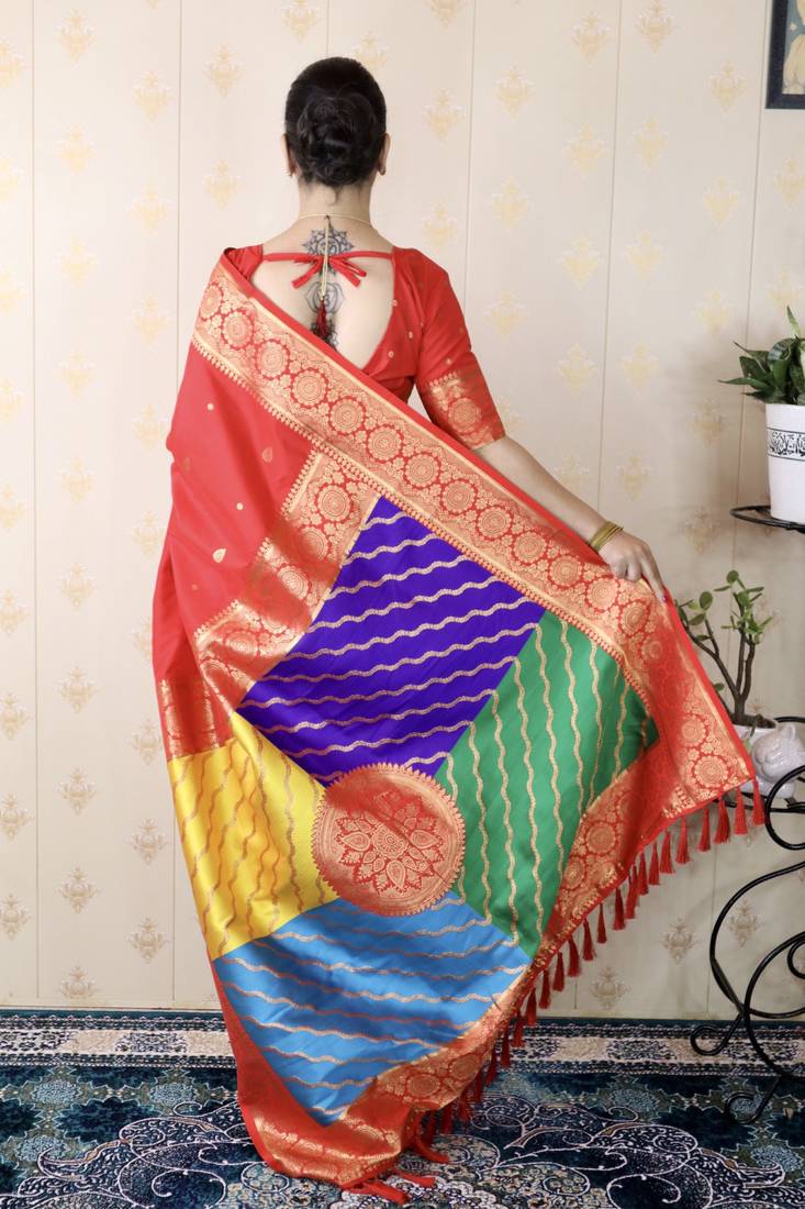 | Product Description | Premium Banarasi Soft Silk Sarees With Gold Zari Motifs All Over The Body, Having Rich Zari Woven Rangkaat Multicolor Pallu And Paired With Brocade Running Blouse |