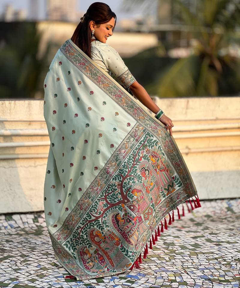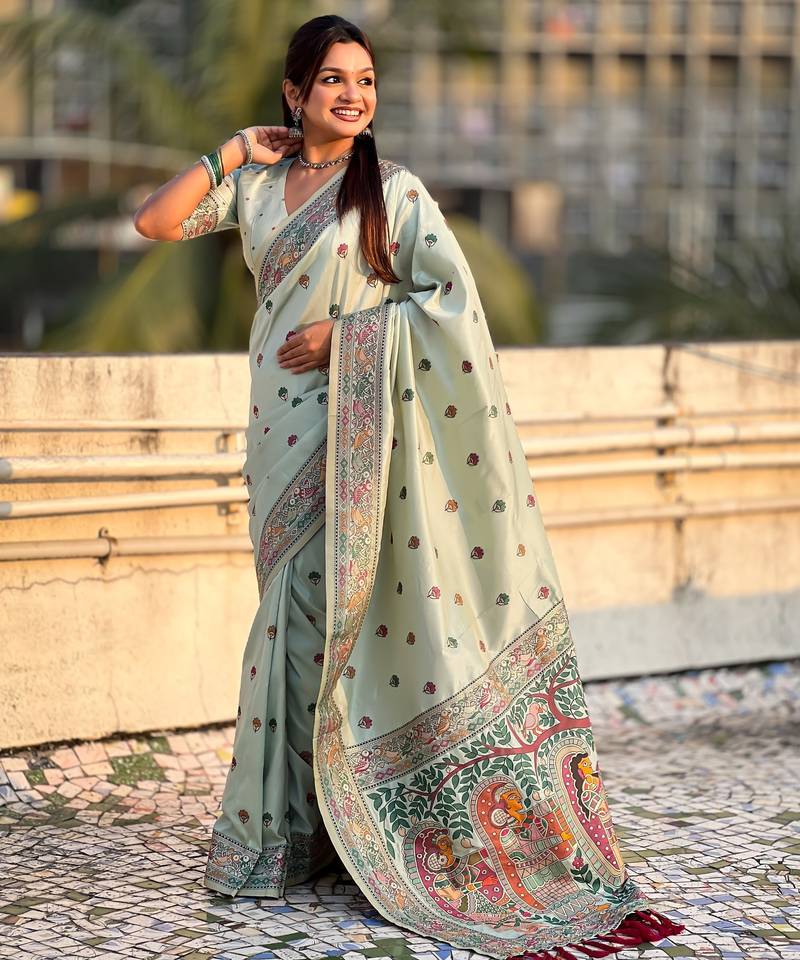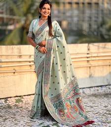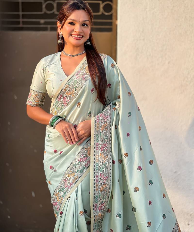 Sea green soft silk baluchari zari meena weaving saree with matching blouse piece