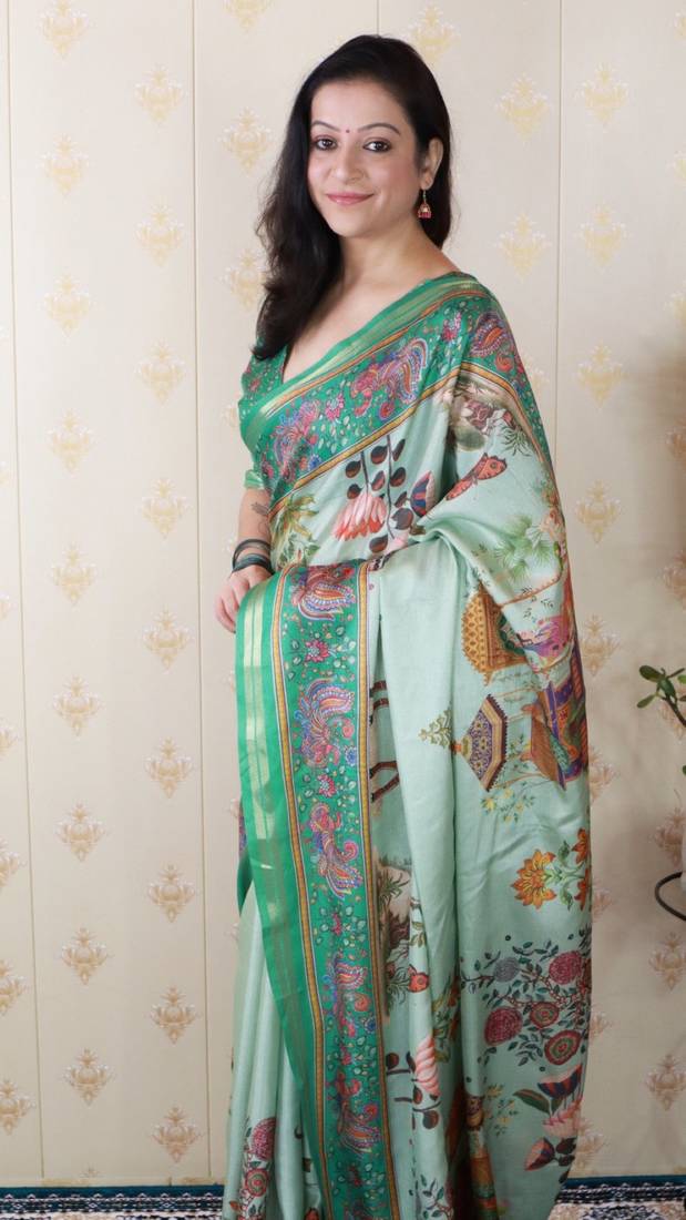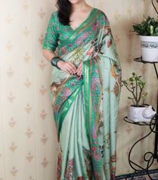 | Product Name | Sea Green Tussar Silk Kalamkari Print Zari Woven Border Saree With Contrast Blouse Piece | |
